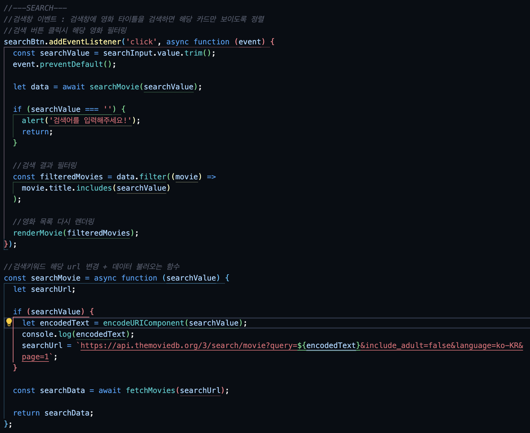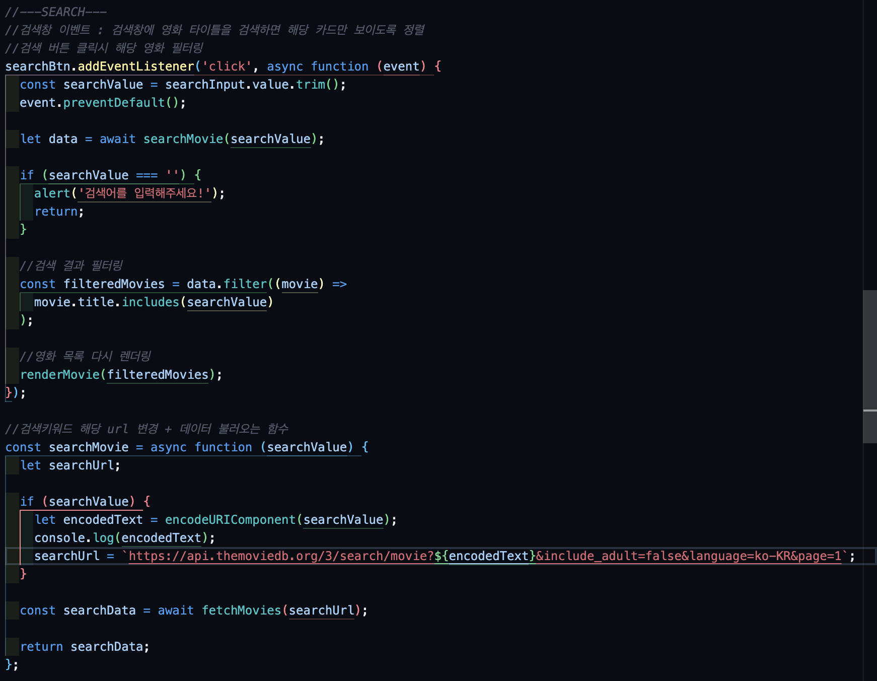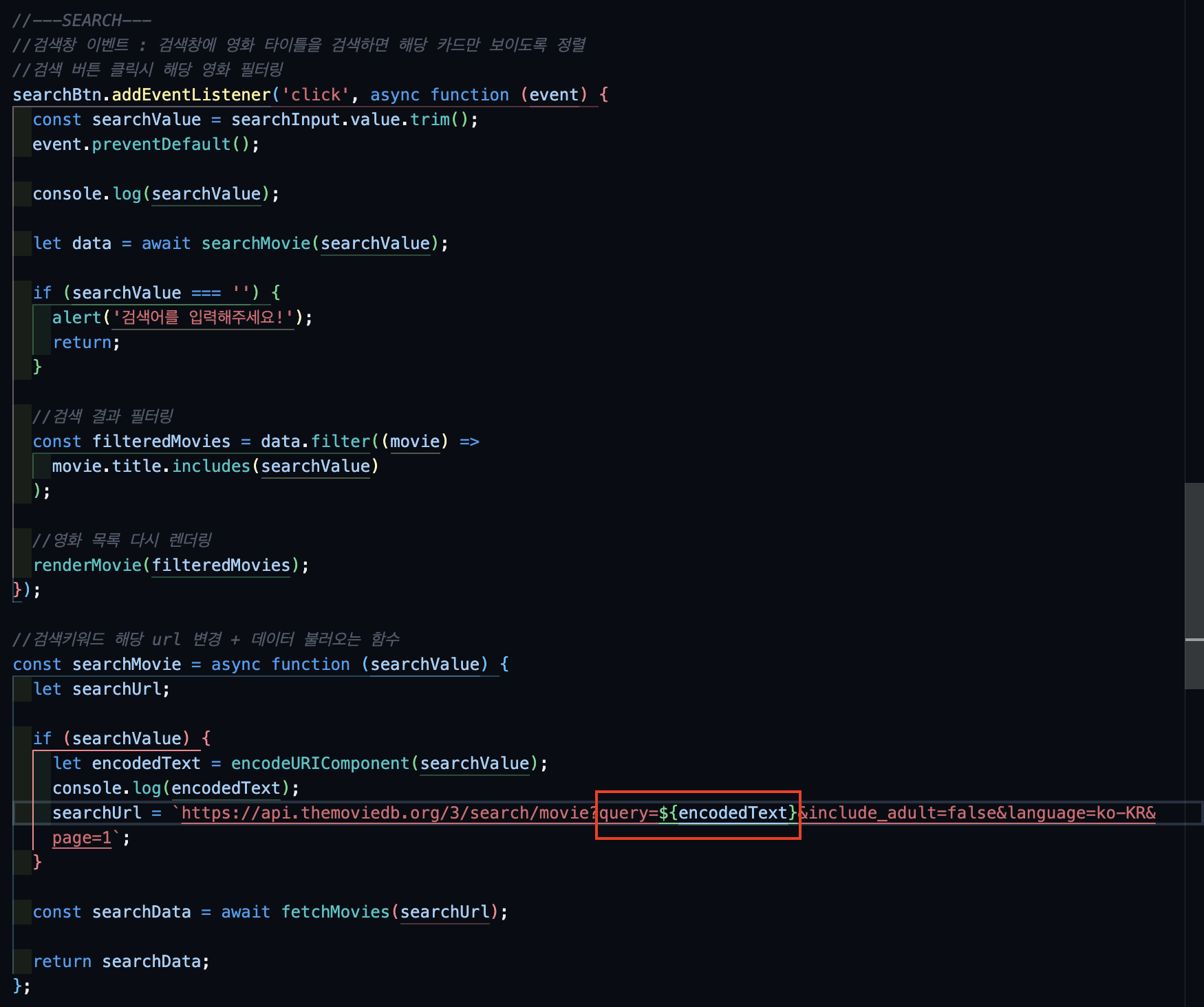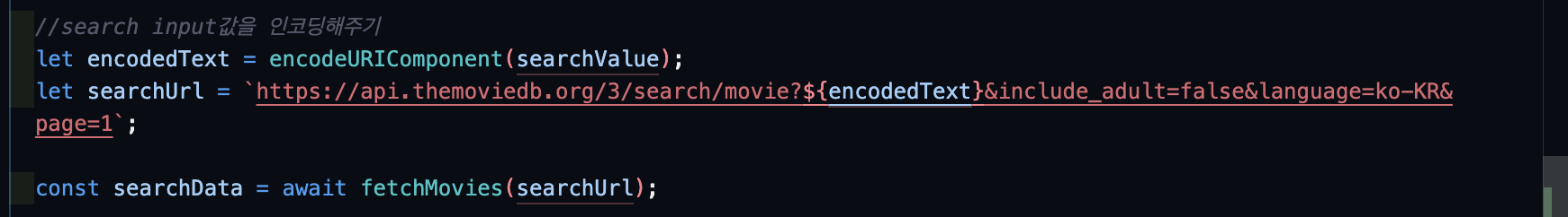 가 들어오면 해당 키워드로 검색용 API url이 바뀌고, 해당 값에 접근이 되도록 searchMovie()