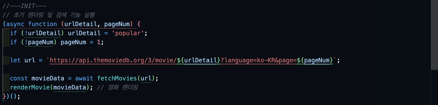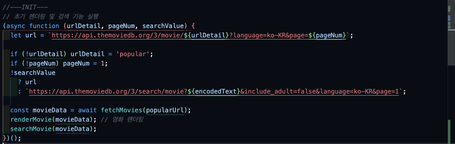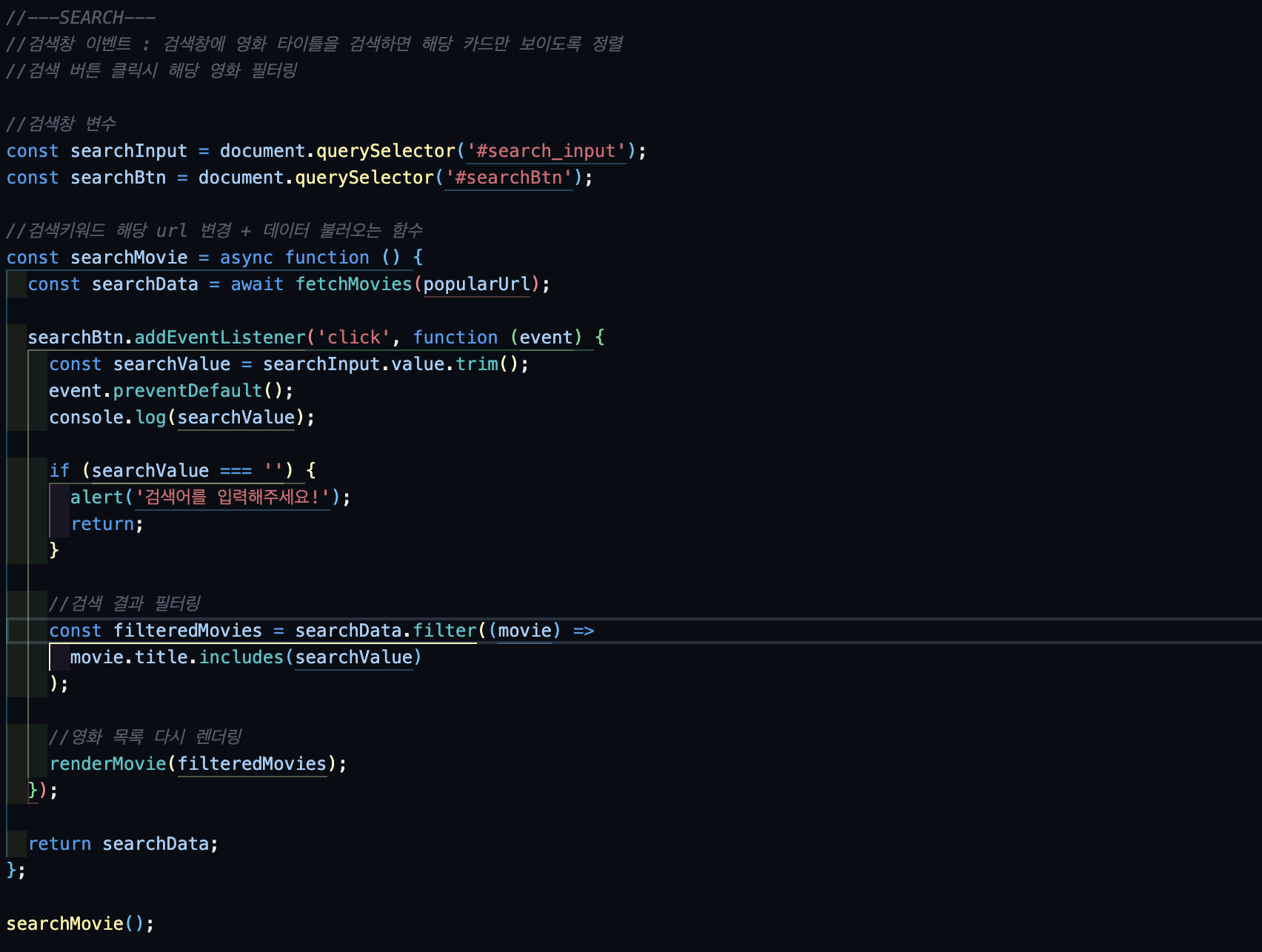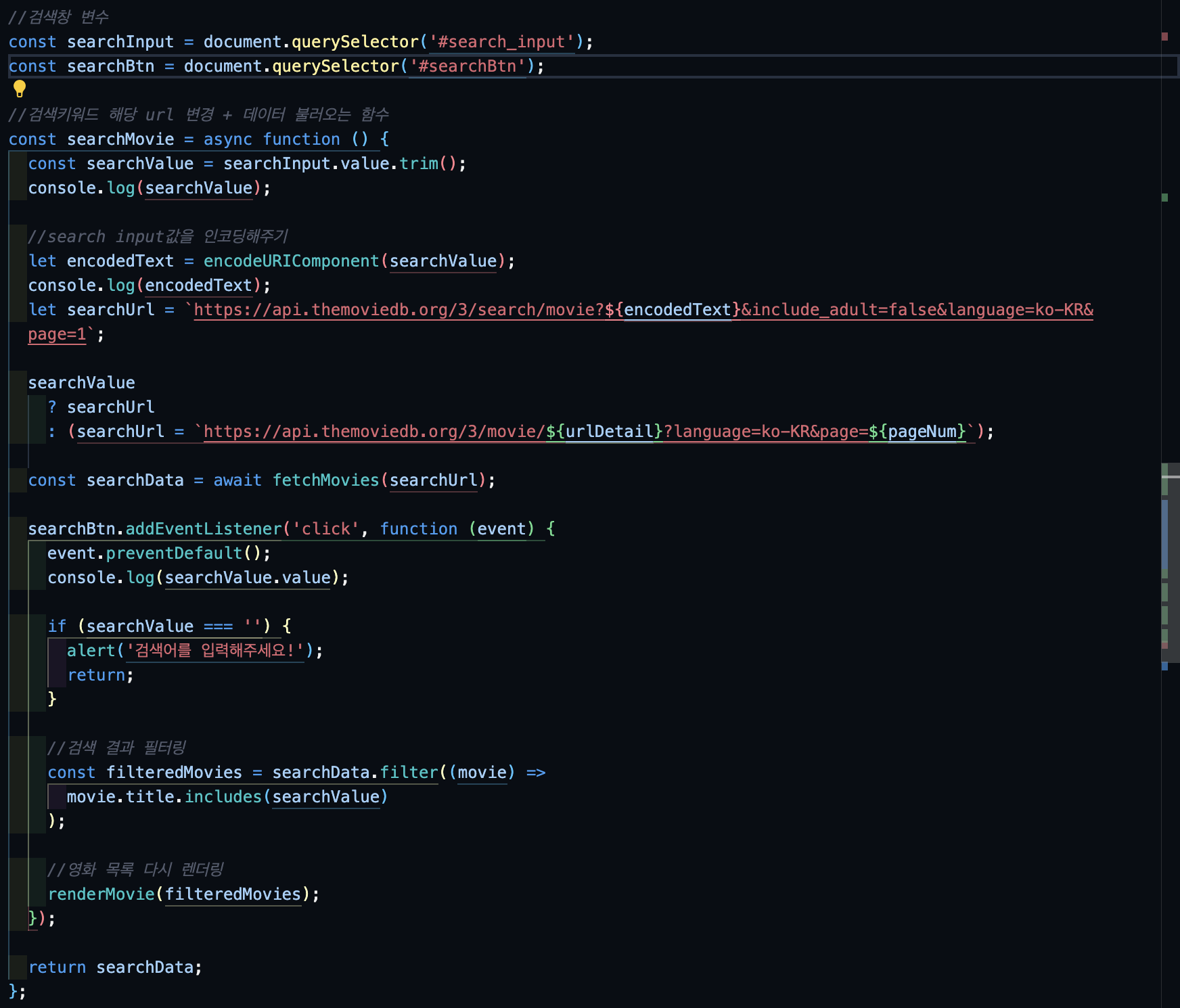 가 있을 수 없기 때문에(페이지가 로딩되자마자 검색창에 값이 있을 수 없다 ), 해당 로직 내에 searchMovie()