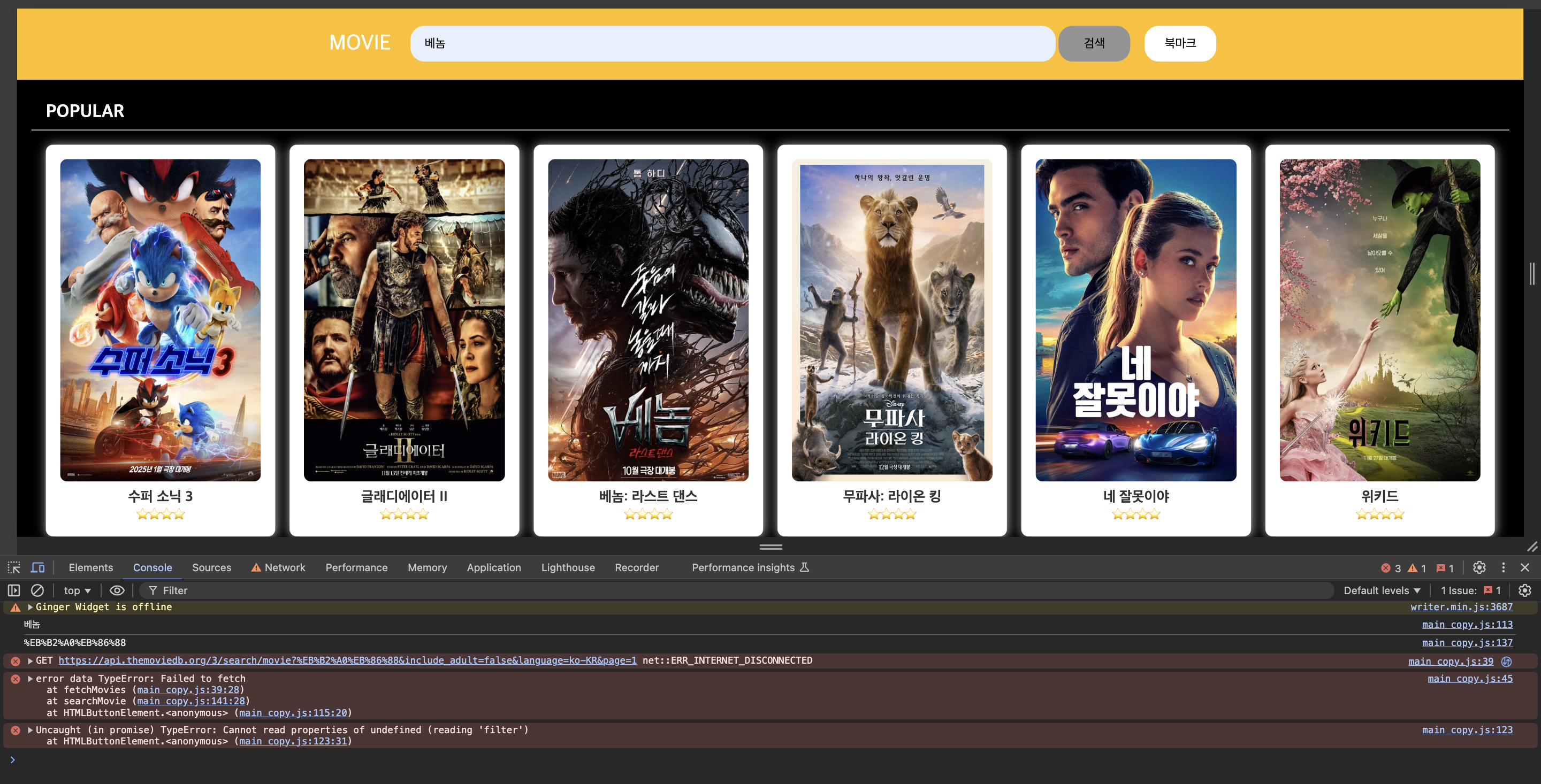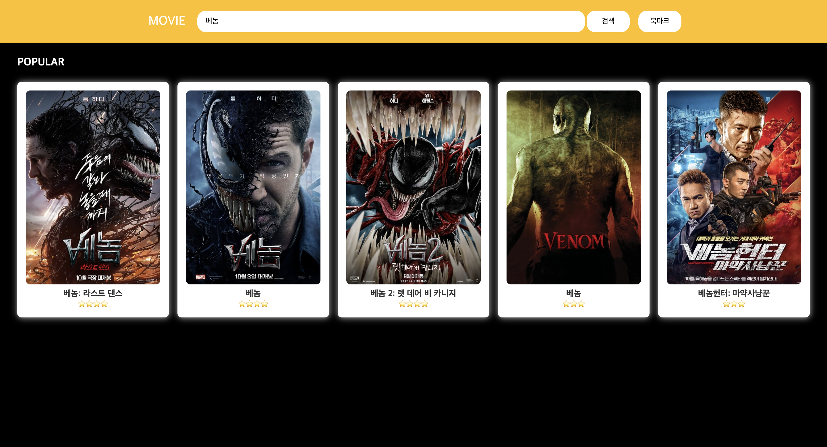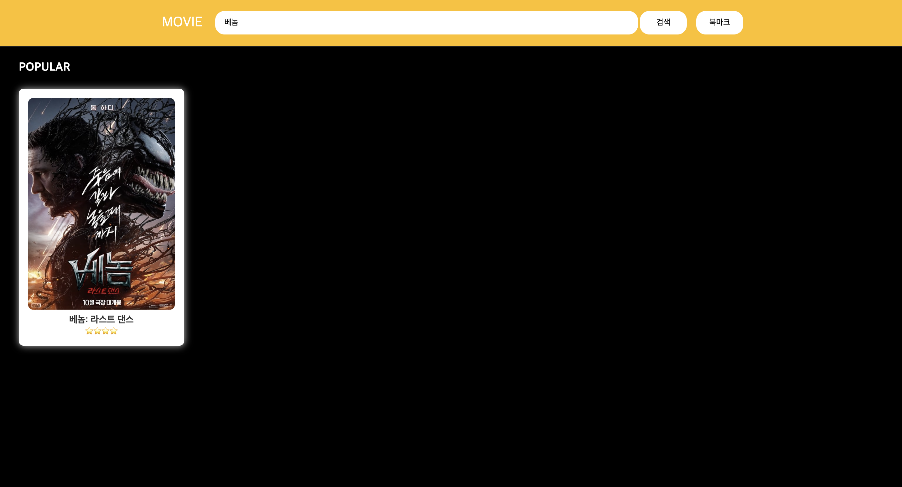 문제는 여기서 발생했다. '베놈 '을 검색 했더니 Popular 목록에만 있던 '베놈: 라스트 댄스 '만 렌더링이 되었다. 즉, 내가 불러온 Popular 영화 20개 내에서만 검색이 가능한 것... 검색하면 해당 영화들이 전부 렌더링 되도록 수정이 필요했다.