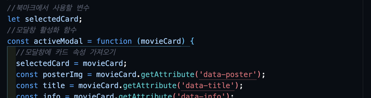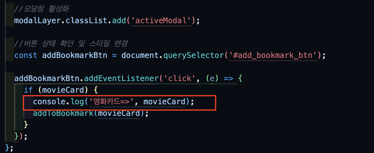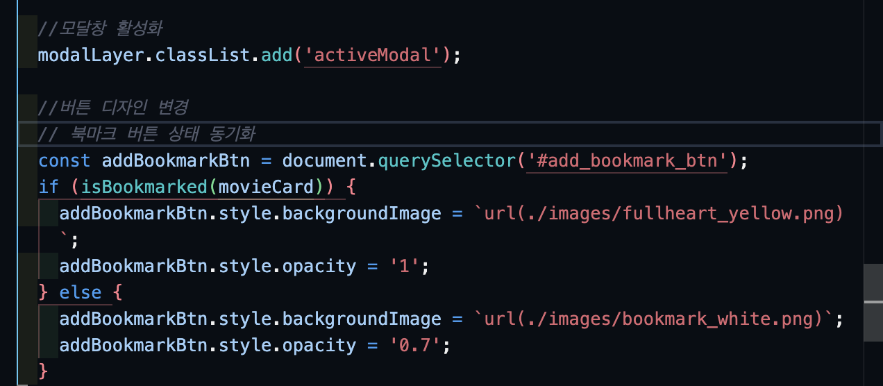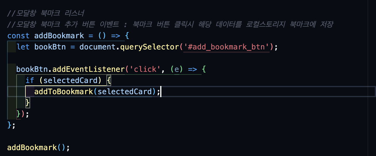 어찌저찌 해결이 되었다...! 하지만 북마크 버튼에 사소한 문제가 생겼다. 처음 북마크를 추가하면 다른 카드들에게도 적용이 되는 것. 모달창을 열 때, 이를 초기화해주고 북마크 추가할 때 스타일 변경을 해주는 로직이 필요했다.