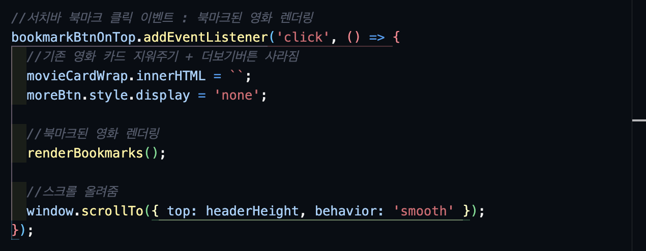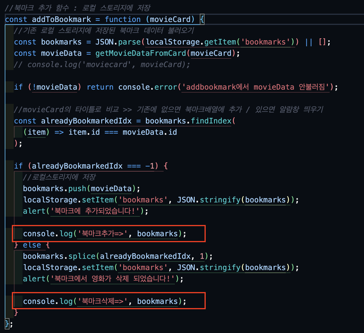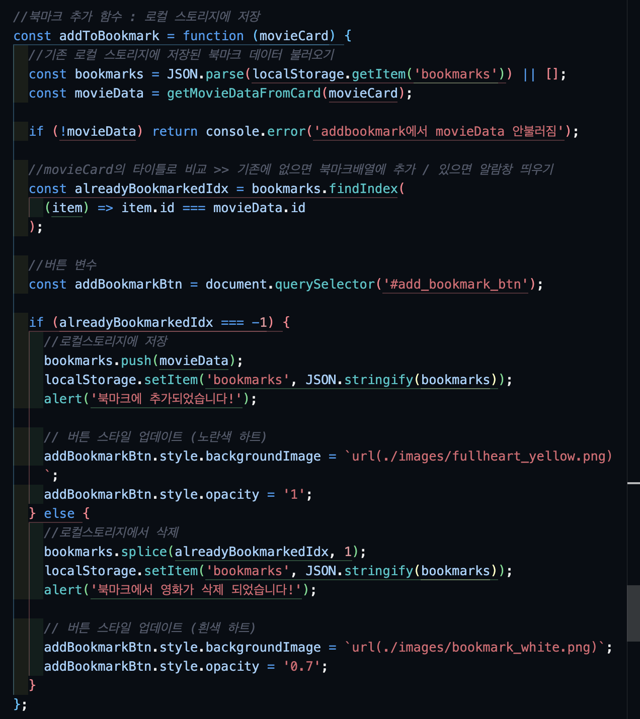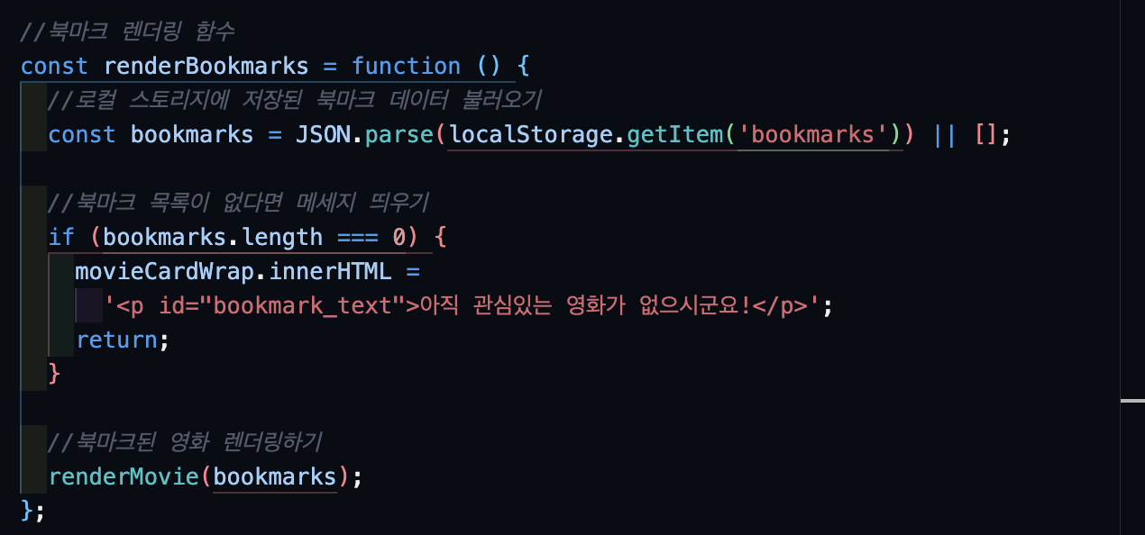 미루고 미루던 북마크 기능을 드디어 도전하는 날이다. 구글링을 통해 만난 선배 개발자분들과 내 절친(aka 챗GPT)의 도움으로 localstorage를 사용해서 해당 영화 데이터를 배열에 추가/삭제하는 방법으로 북마크 기능을 구현할 수 있다는 것을 알게 되었다.