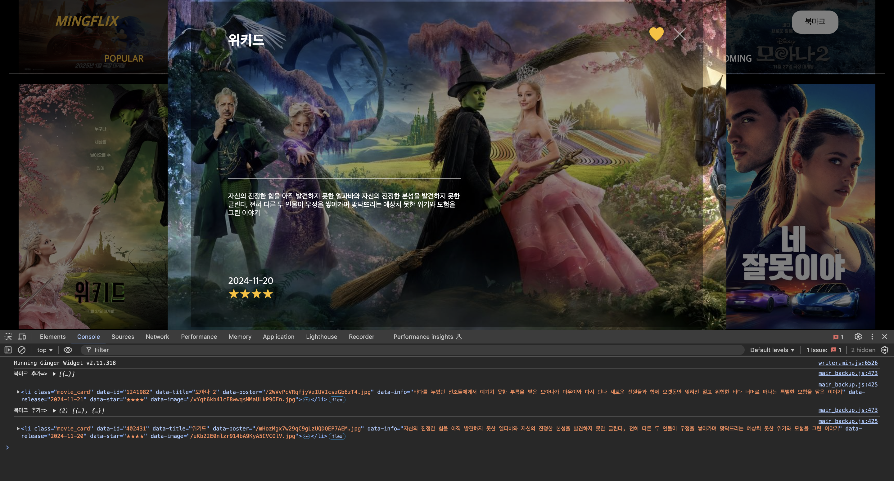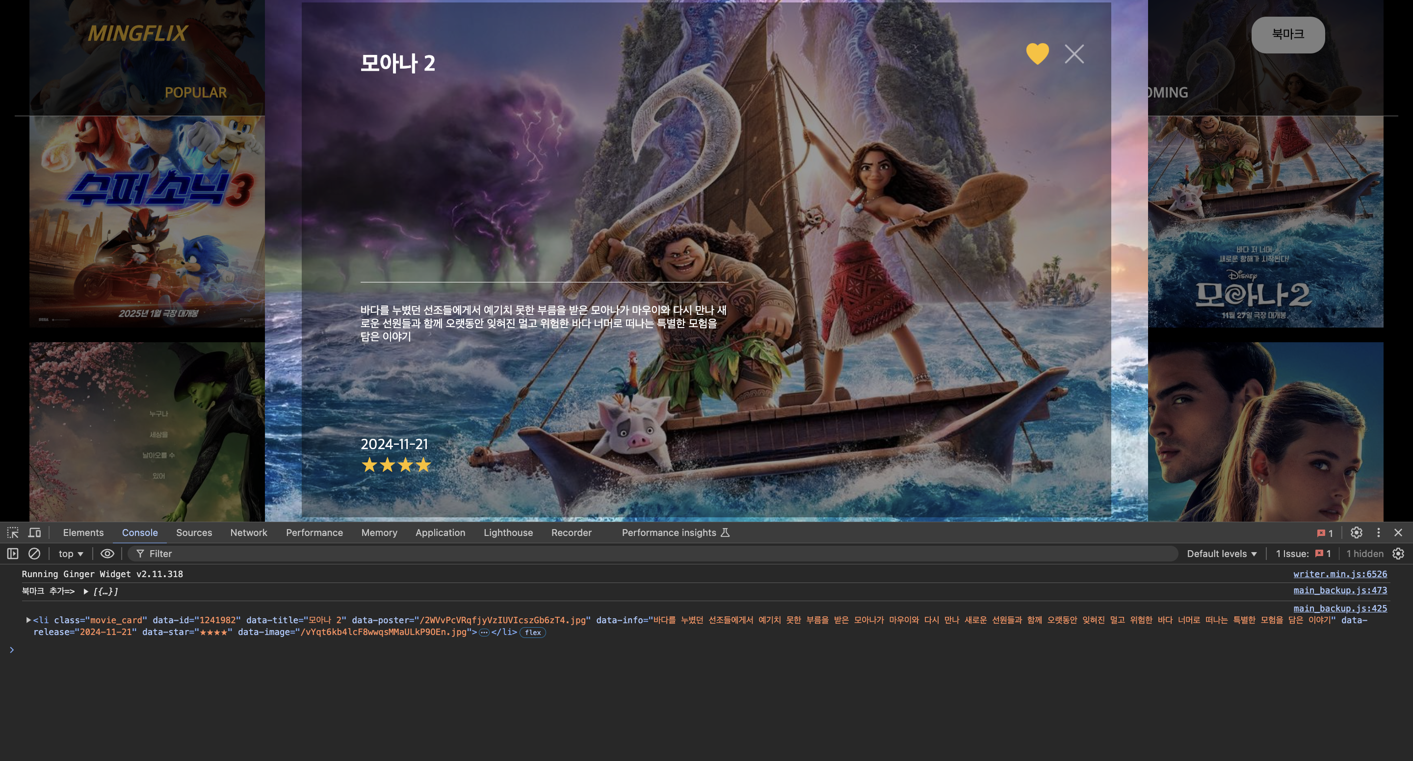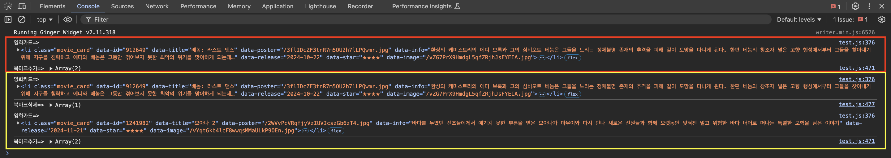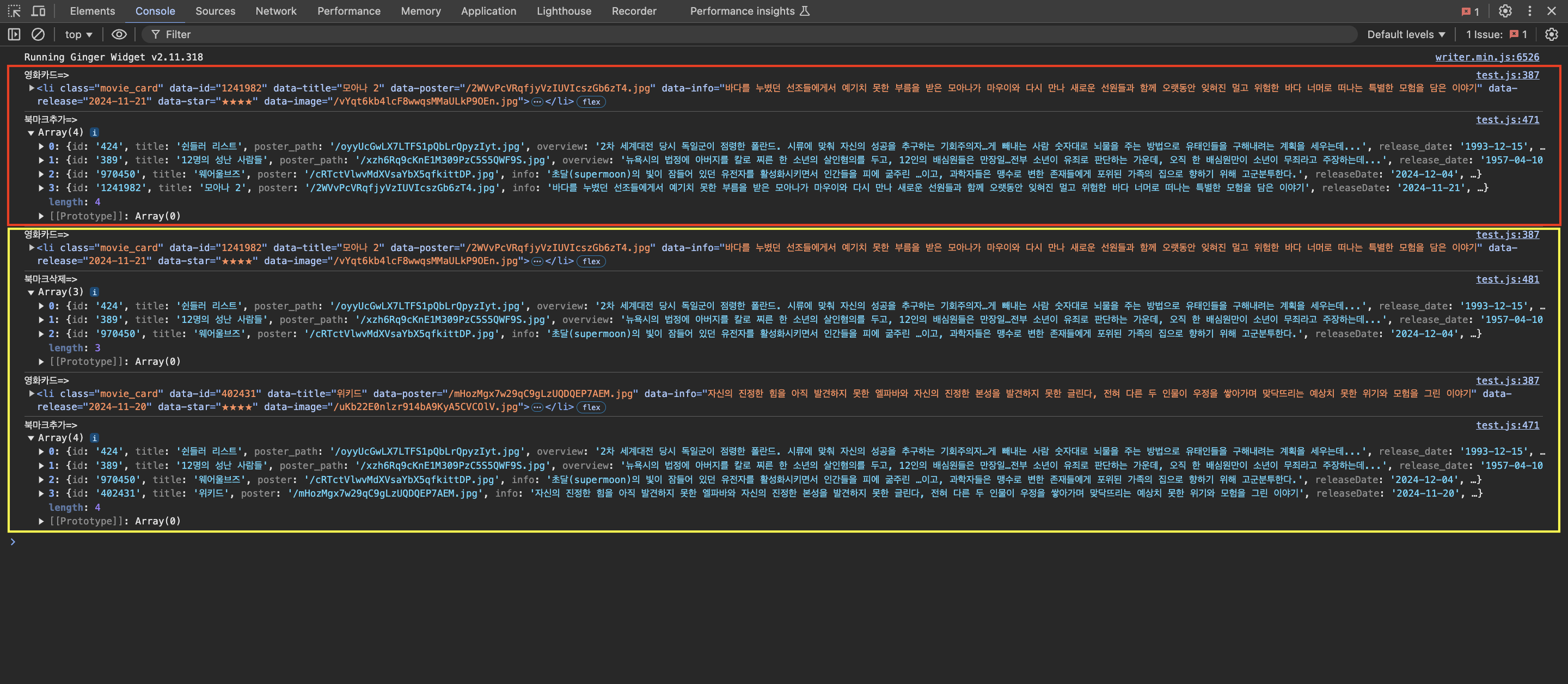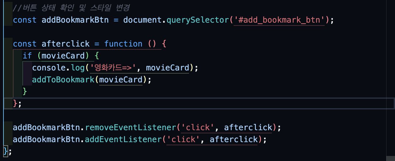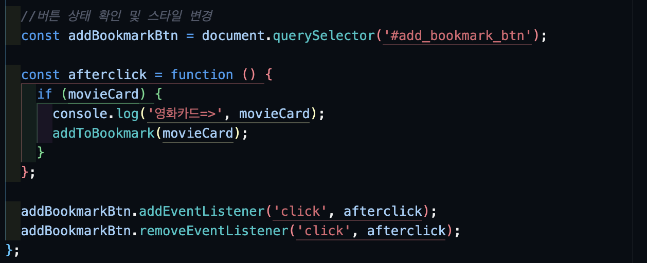 두번째 클릭을 할 때, 이전에 클릭한 영화카드 정보가 또다시 콘솔에 찍히는 것을 확인할 수 있었다. 원인이 뭘까...