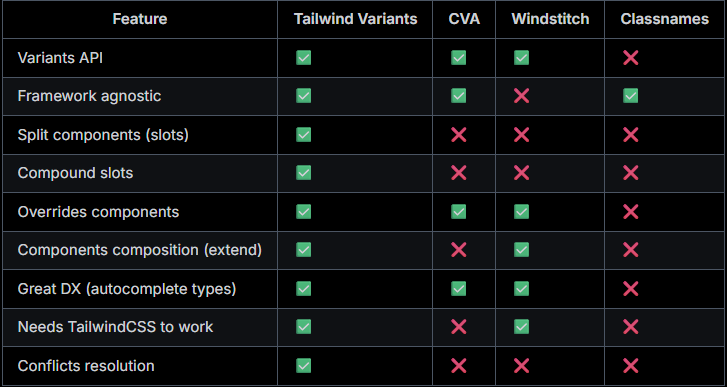Our goal is not to compete with CVA, but to provide an alternative that meets our needs to migrate HeroUI to TailwindCSS as smoothly as possible. We recommend to use CVA if don't need any of the Tailwind Variants features listed above.