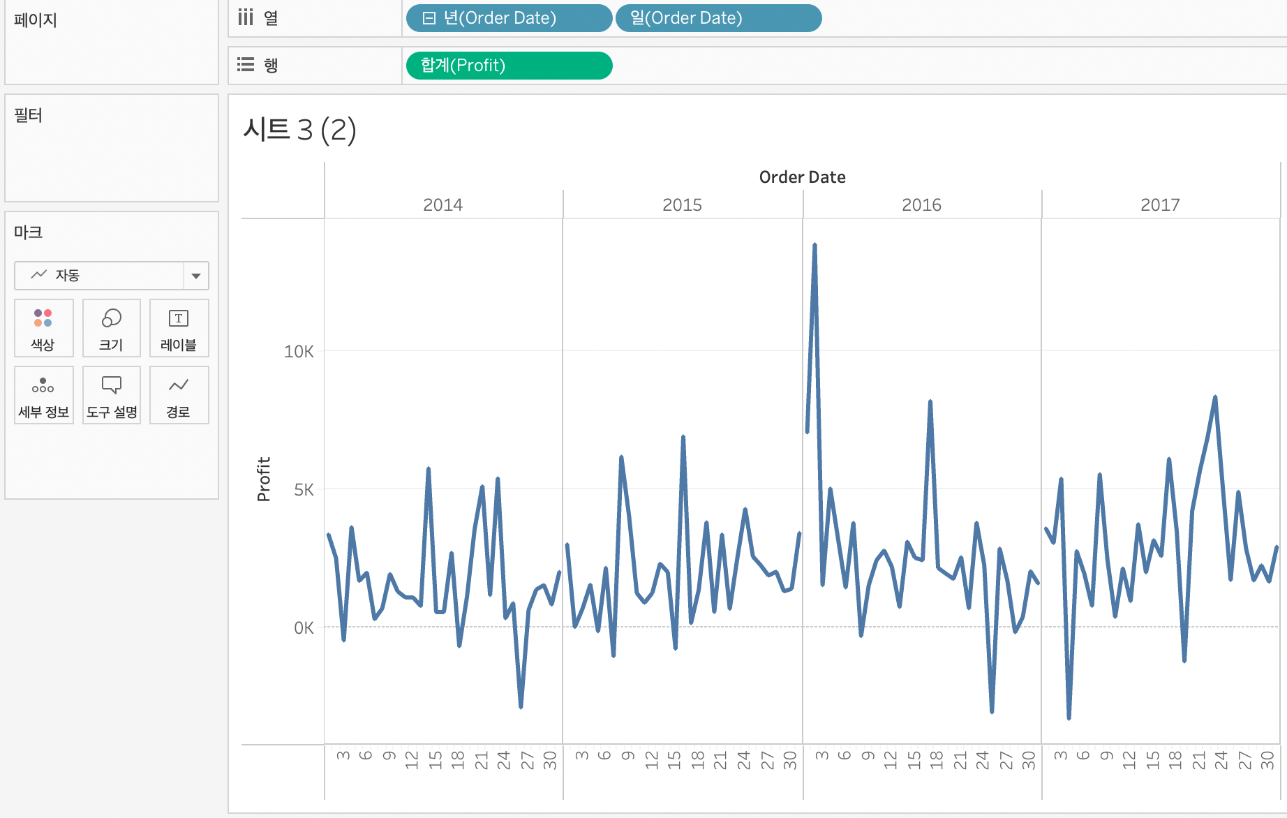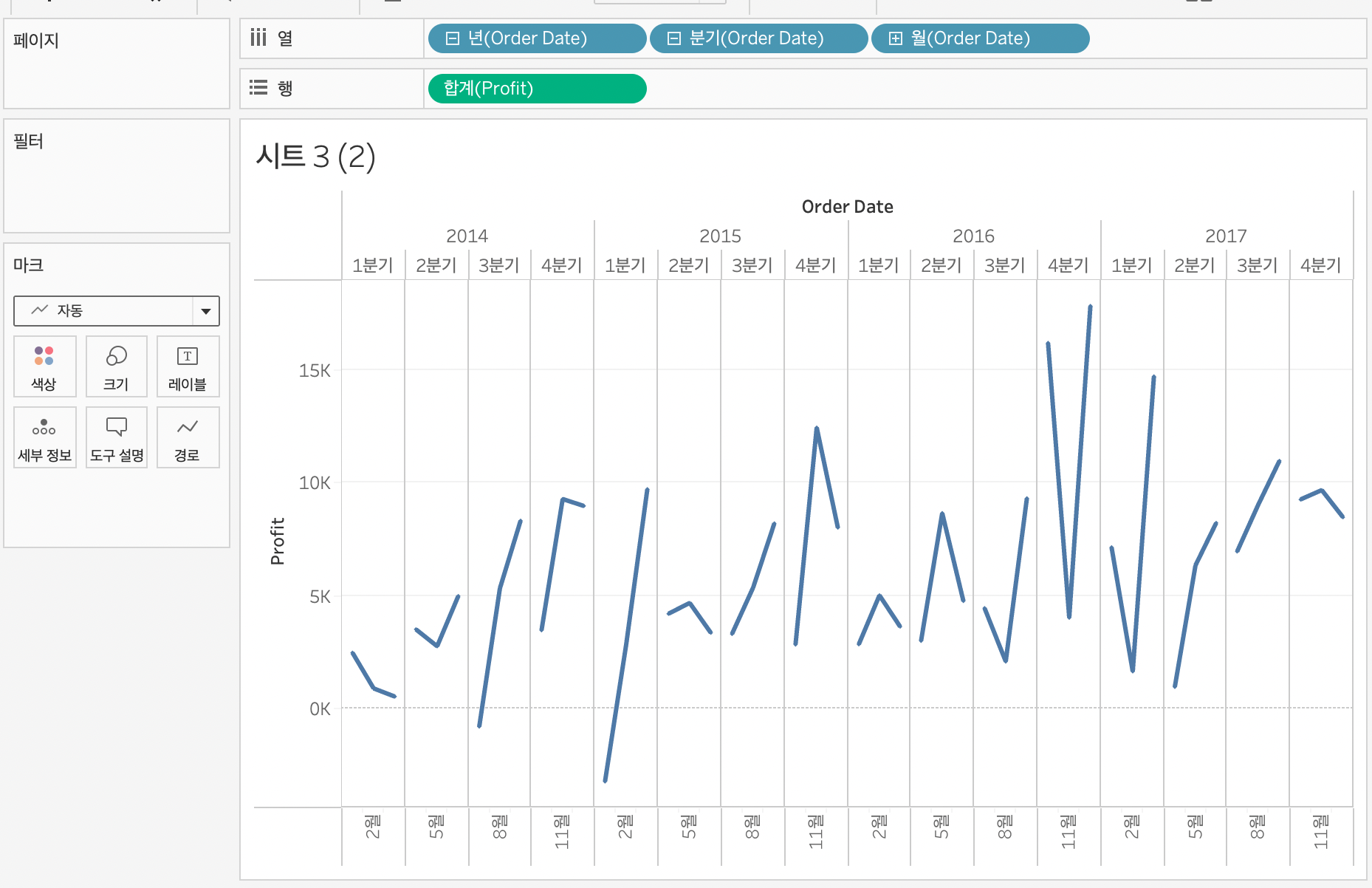 열에다가 Order Date와 같은 시계열 필드를 넣으면 이런식으로 라인이 자동생성 된다. 이 때 열의 Order Date의 삼각형 버튼을 누르면 년, 분기, 월, 일 등으로 그래프를 생성할 수도 있다.