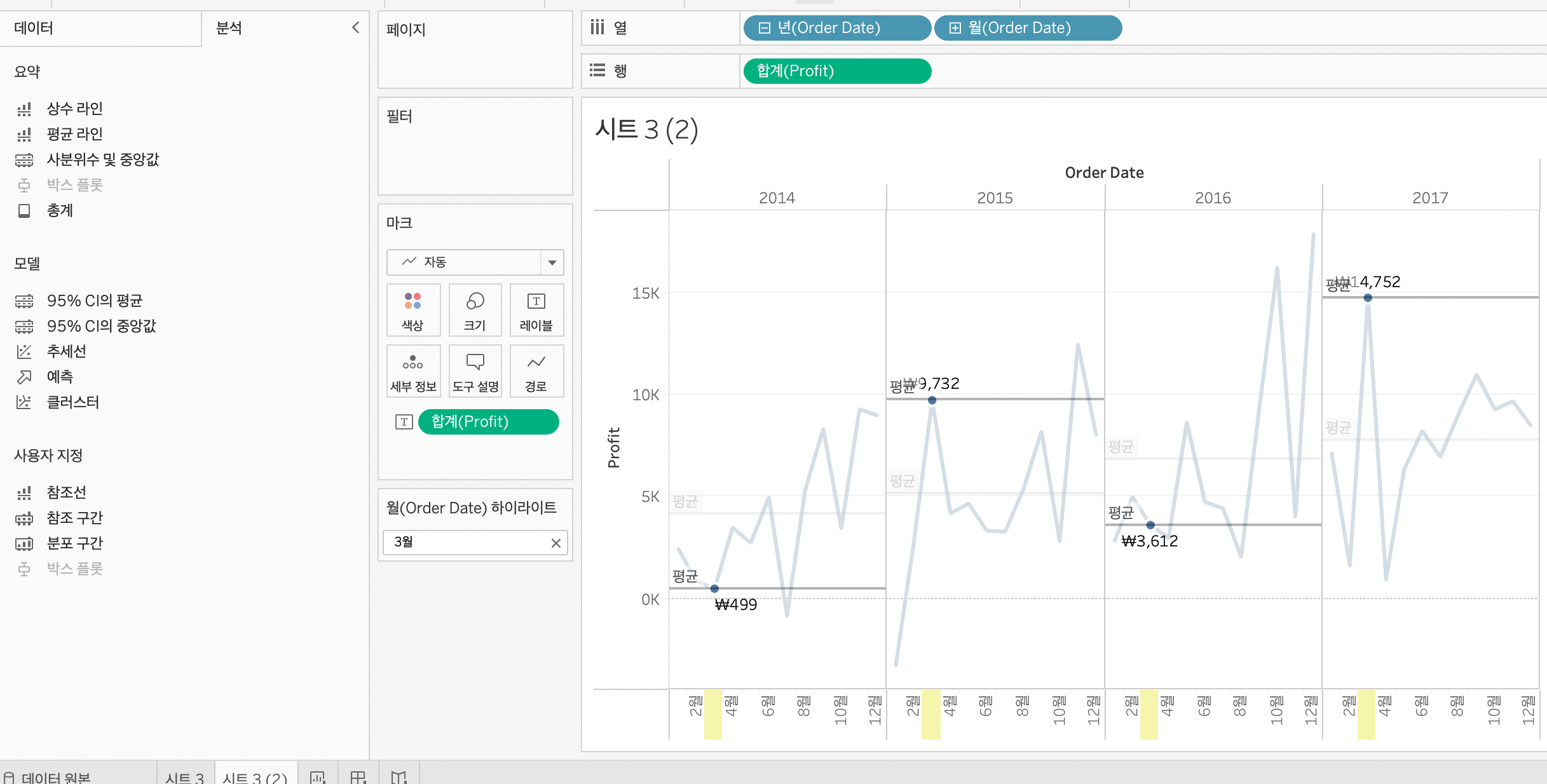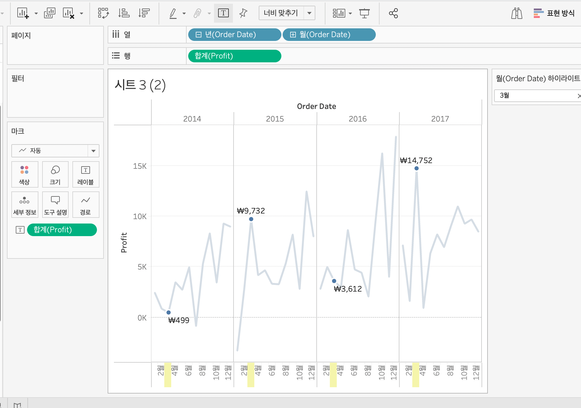 레이블에 [하이라이트] 서식을 클릭한 뒤, 열에 있는 월 Order Date를 클릭한 후, 하이라이트 표시를 클릭하면 오른쪽 같은 네모칸이 생기는데 이때 3월을 클릭하면 그림과 같이 3월만 레이블이 표시되는 것을 확인할 수 있다.