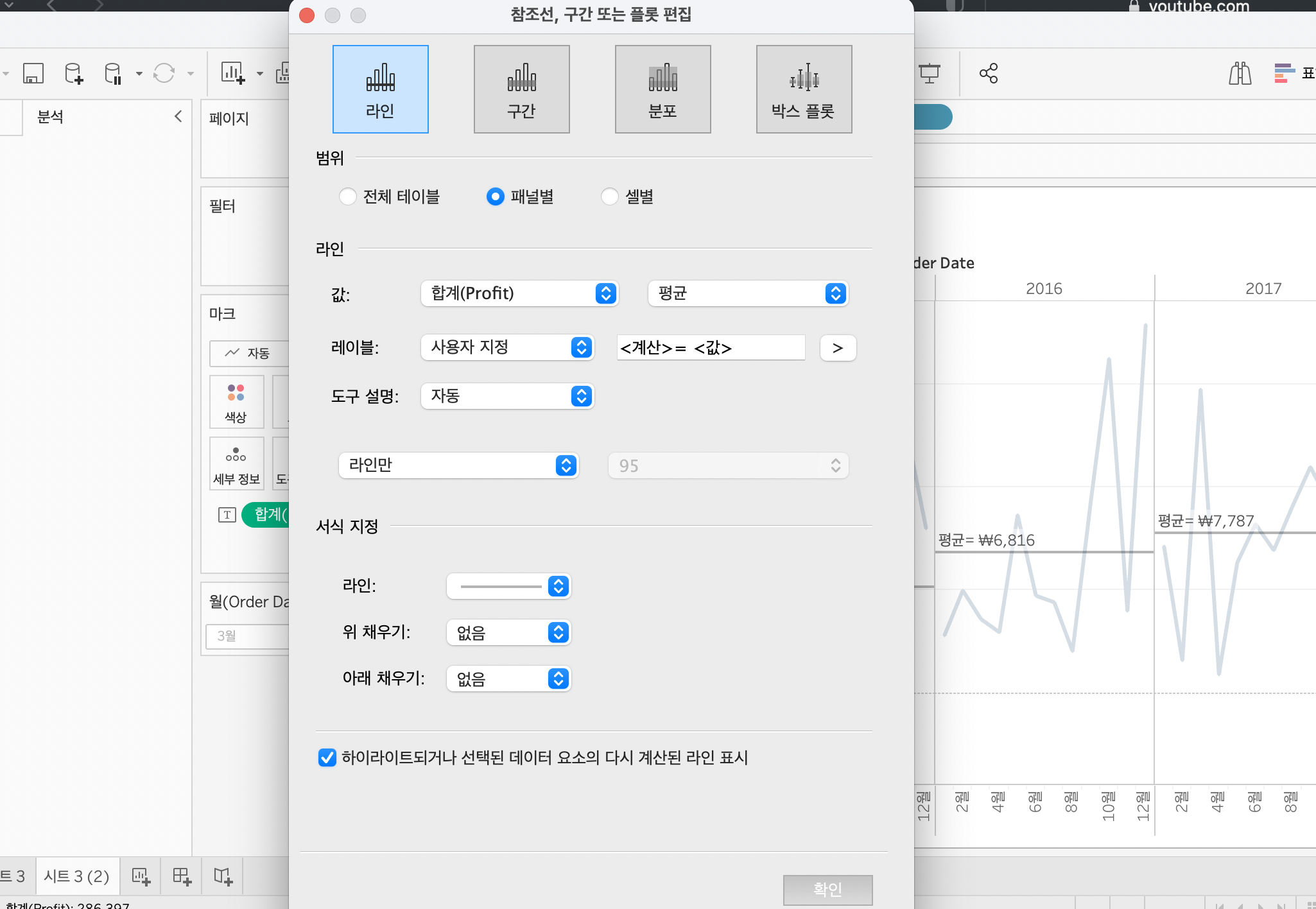 생성된 평균 라인을 우측 클릭한 후, 편집을 누르면 다음과 같은 팝업이 뜨는데 이때 레이블을 [사용자 지정], 그리고 우측 화살표 버튼을 클릭해 [계산] 엔터, = 입력, 다시 우측 화살표 버튼 클릭해 [값] 엔터를 하고 확인을 누르면 평균 라인에 레이블이 생기는 것을 확인할 수 있다.