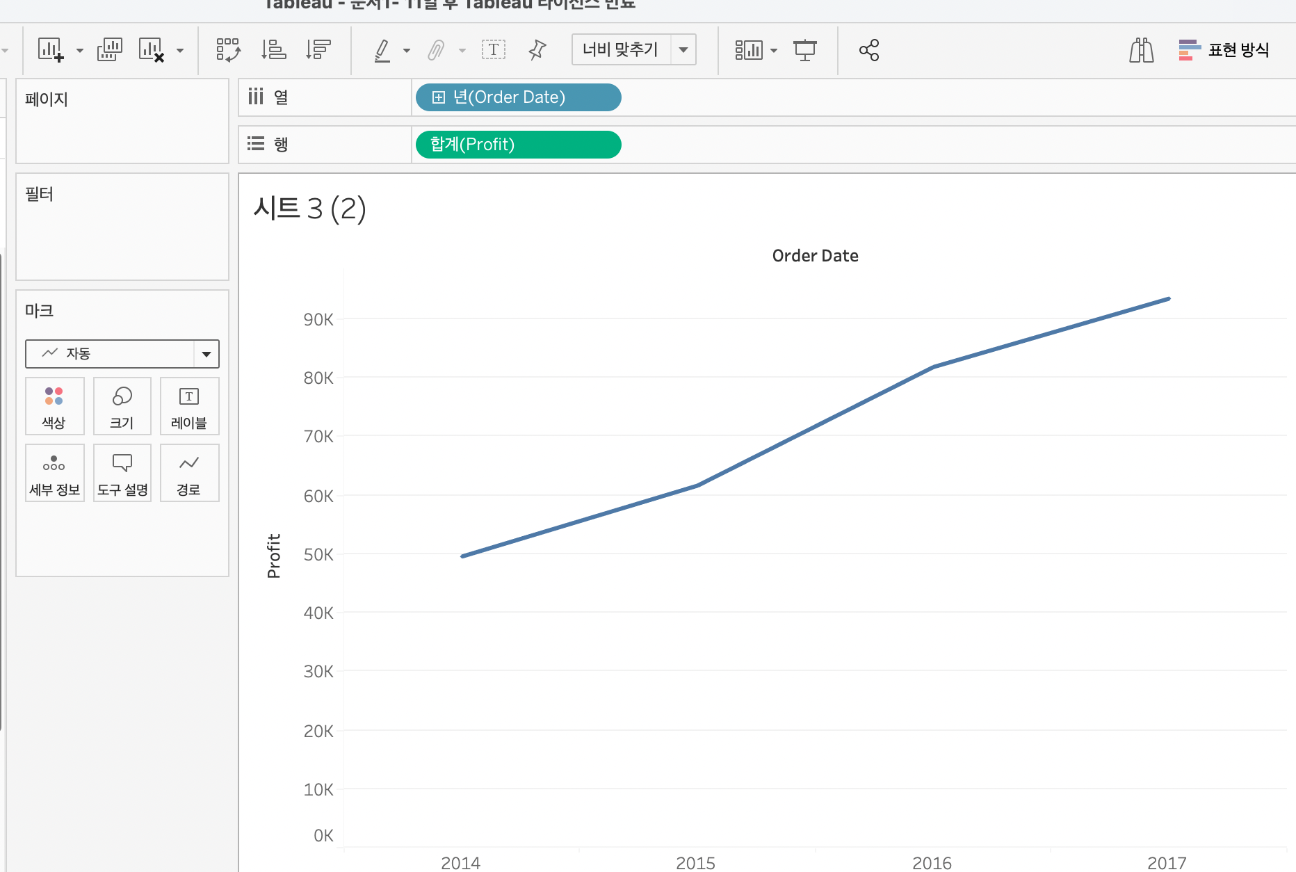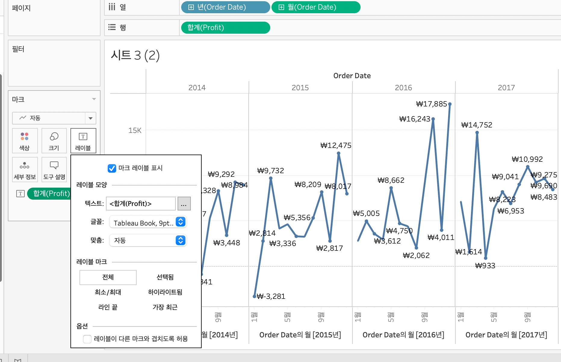 이런식으로 Profit에 대한 레이블을 생성할 수 있는데, 레이블을 클릭해 나타나는 옵션 [레이블이 다른 마크와 겹치도록 허용]을 꺼야지 지저분한 모습을 피할 수 있다. 또한 레이블 마크를 통해 다양하게 표시가 가능하다.