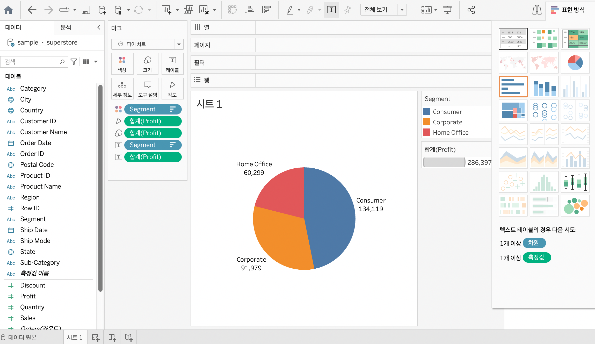 우측 상단에 [표현방식]을 클릭하면, 태블로에서 작성할 수 있는 그래프 종류가 나타난다. 이때 예시로 좌측 [테이블]의 Segment 필드를 클릭하면 이 데이터를 활용하여 만들 수 있는 그래프가 표시되고, Mac의 경우 [Command] 버튼을 누른 상태로 다른 필드, 여기서는 [Profit] 필드를 클릭하면 두 가지 필드를 함께 시각화할 수 있는 그래프가 표시된다.