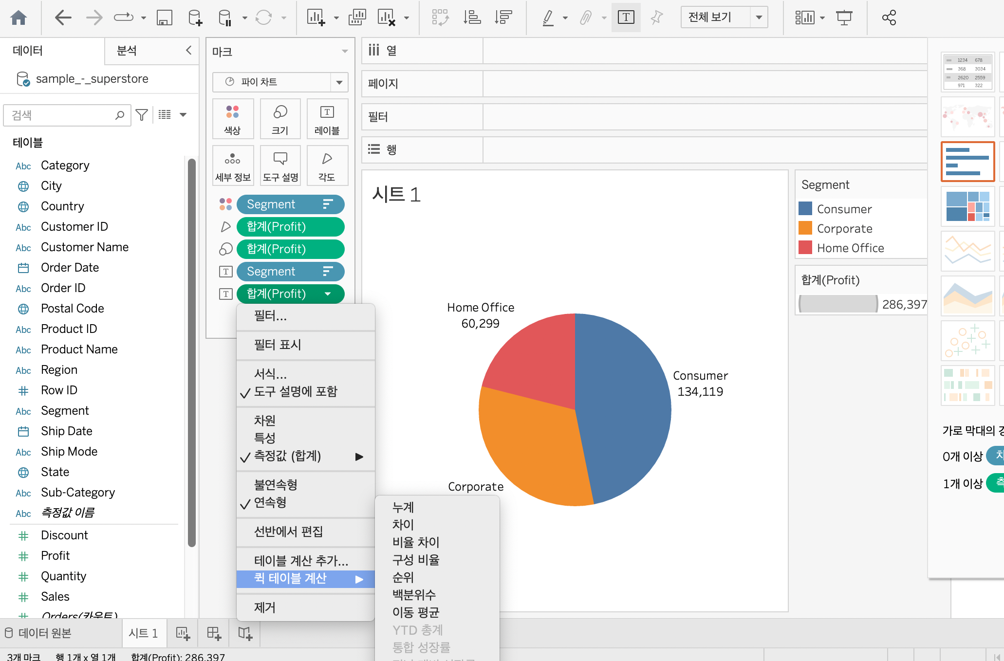 값을 계산해주는 방법은 [마크]의 합계 필드의 삼각형 부분을 클릭한 후, [퀵 테이블 계산]을 골라주면 된다.