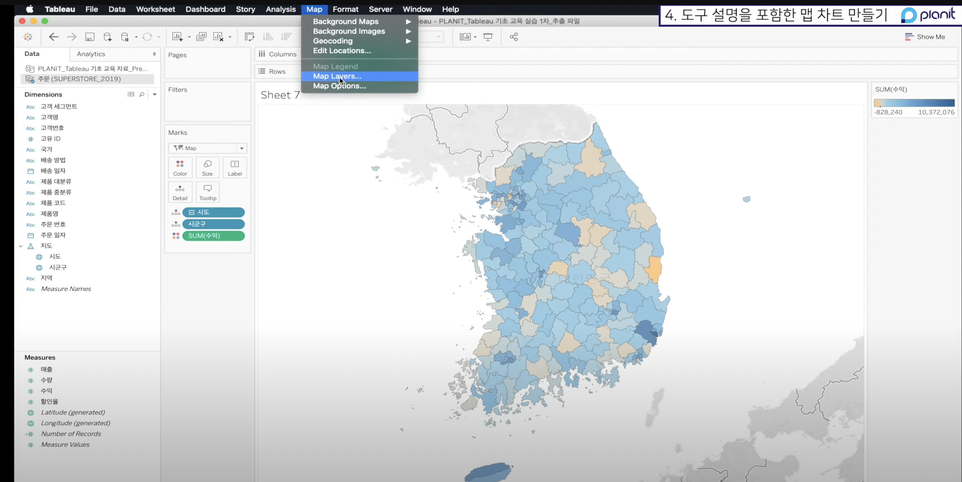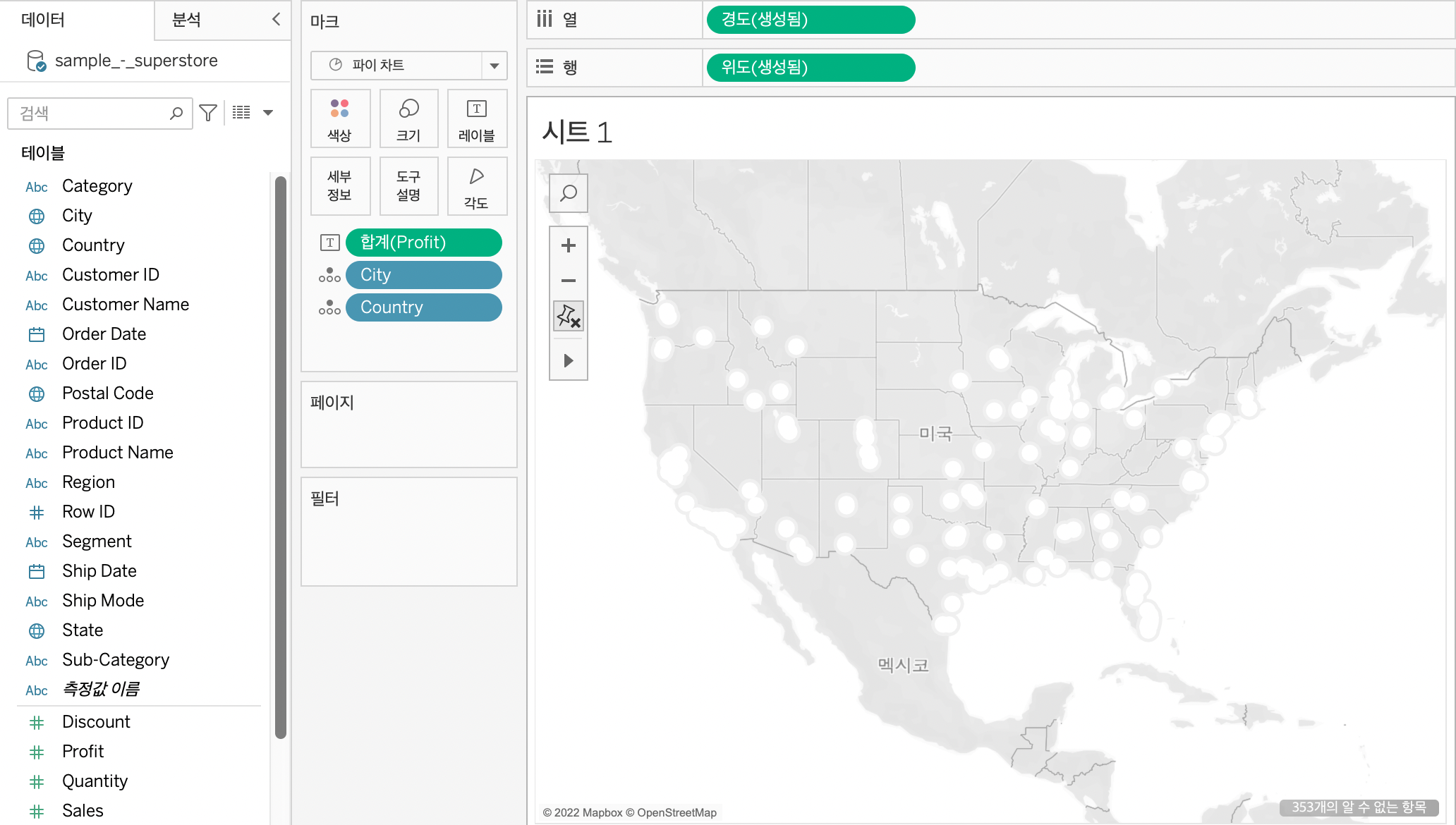 이후 [마크]에서 [Map]을 선택하면 이런식으로 시각화가 가능하다.