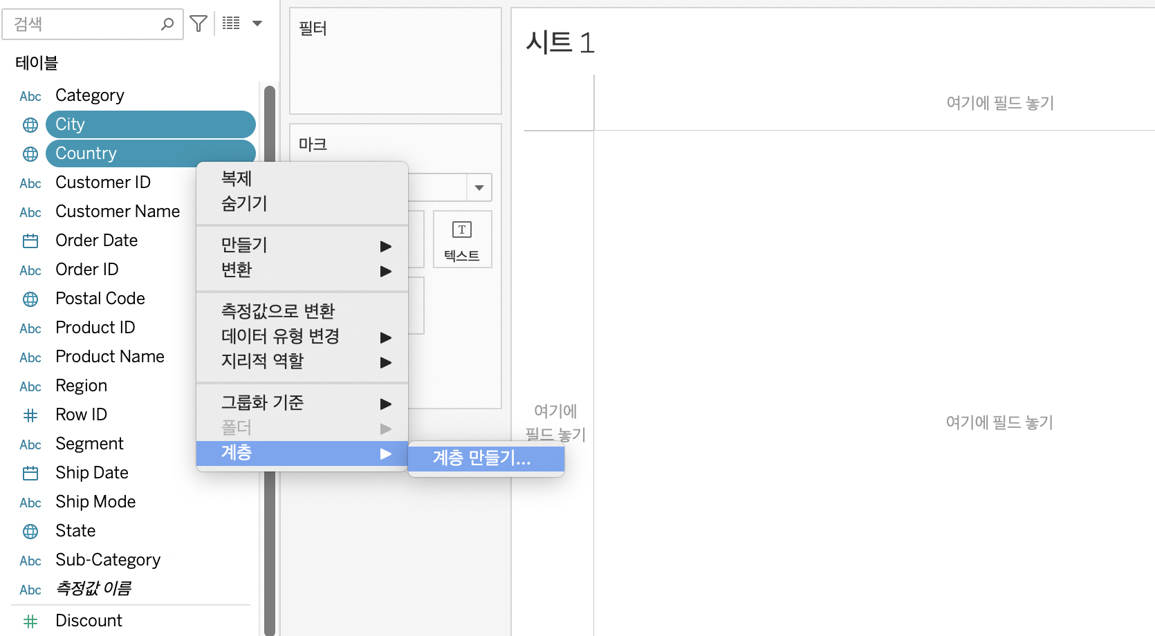 [Command]를 누른 상태에서 묶고 싶은 필드들을 클릭한 후, 우측 크릭을 하면 계층 만들기를 통해 원하는 그룹으로 묶을 수 있다.