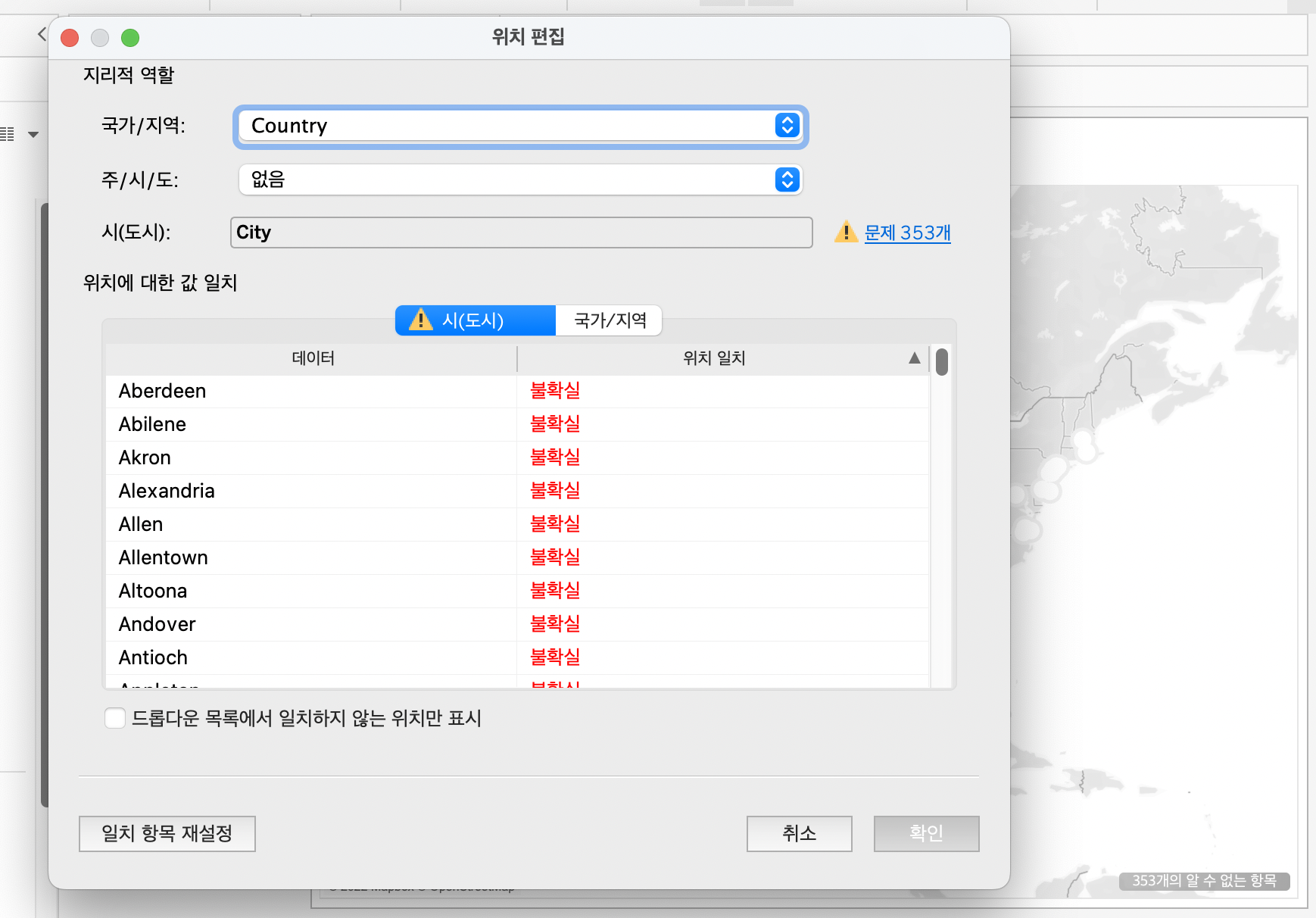 우측하단에 [n개의 알 수 없는 항목]을 클릭하면, 지리적으로 누락된 목록들이 뜨는데 이 때 [위치 편집]을 이용해서 직접 수정이 가능하다.