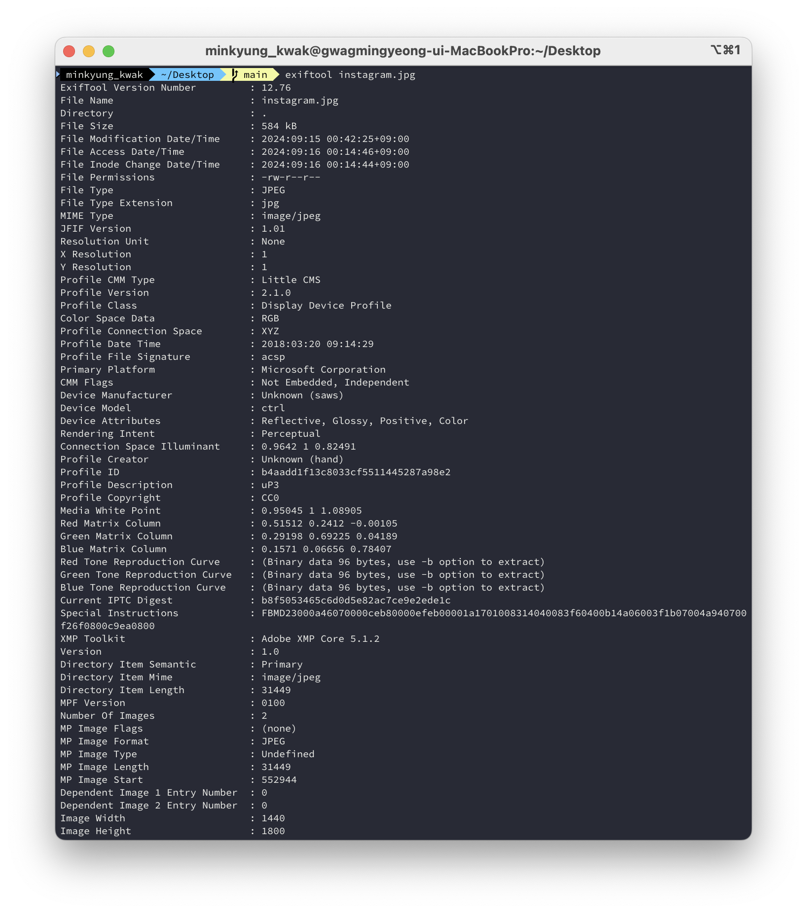 exiftool instagram.jpg(인스타그램에서 다운 받은 이미지 파일)