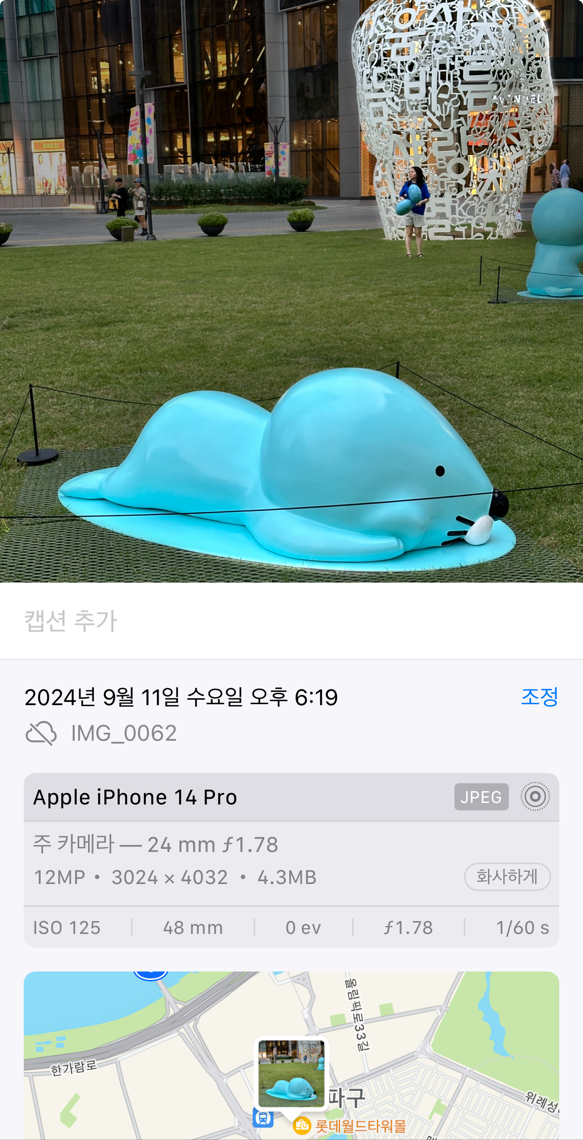 본 사진은 9월 11일 18시 경에 잠실에서 아이폰14pro로 촬영했으며 파일 유형 확장자는 jpg이다.