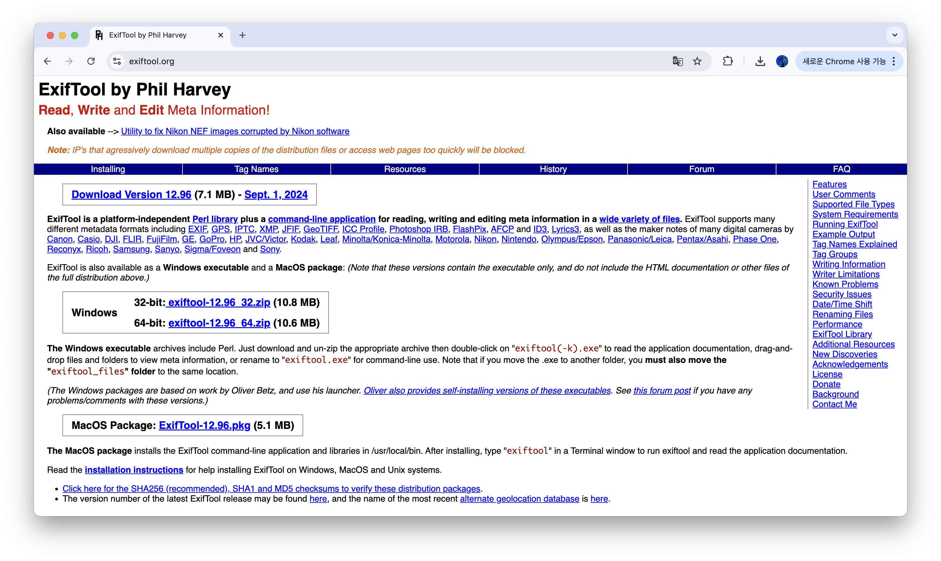 ExifTool은 다양한 형식의 파일에서 메타 데이터를 읽고, 작성하고, 수정할 수 있는 강력한 도구이다. 원래는 이미지 파일의 메타 데이터(특히 EXIF 데이터)를 처리하기 위해 만들어졌지만, 현재는 이미지, 비디오, 오디오, 문서 등 여러 파일 형식을 지원한다.