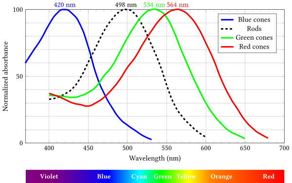 M-cone: Medium cone으로 파장이 중간인 Green영역을 감지 S-cone의 20배 개수