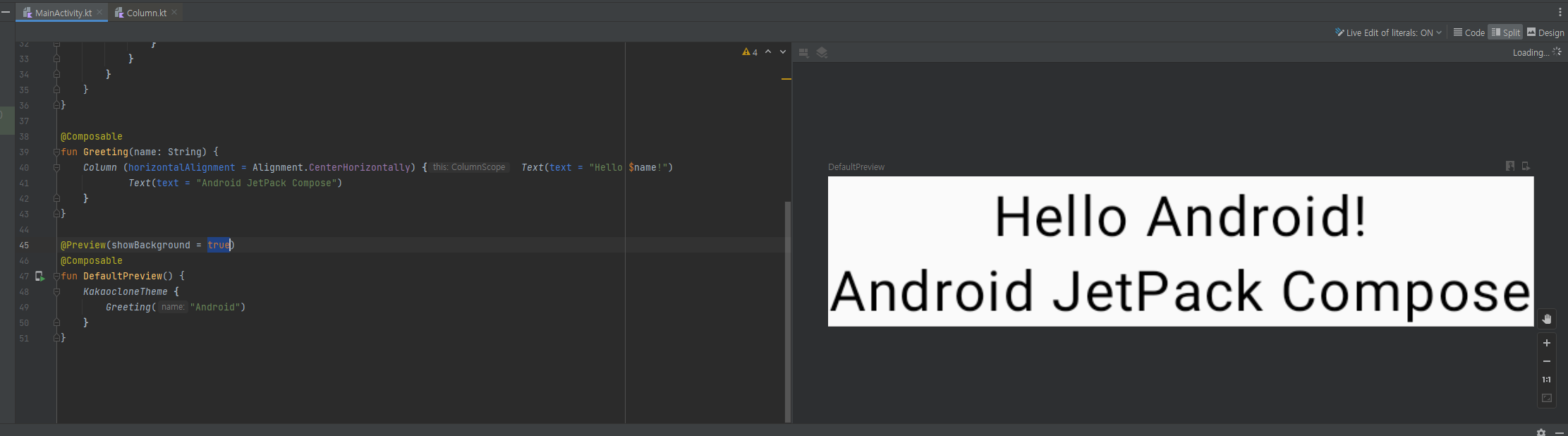 Preivew 태그를 한 하위 Composable의 결과를 바로바로 볼 수 있다. (에뮬레이터 없이도)