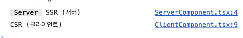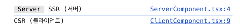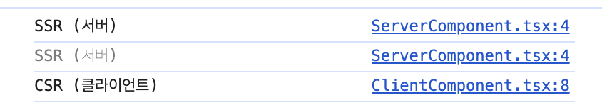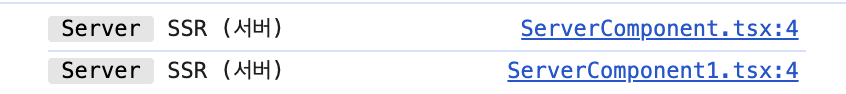 ※ SSR (서버)라는 메시지는 컴포넌트 별 구분을 위한 차이일뿐, Server라는 회색태그가 없으므로 둘다 Client Side이다.