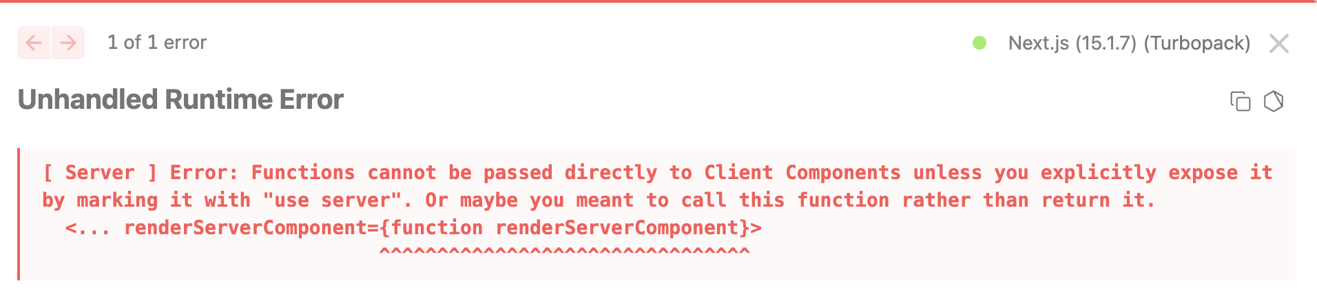 하지만 renderServerComponent는 서버컴포넌트를 렌더시키는 함수이기 때문에 이런 에러를 뱉는 것이다.