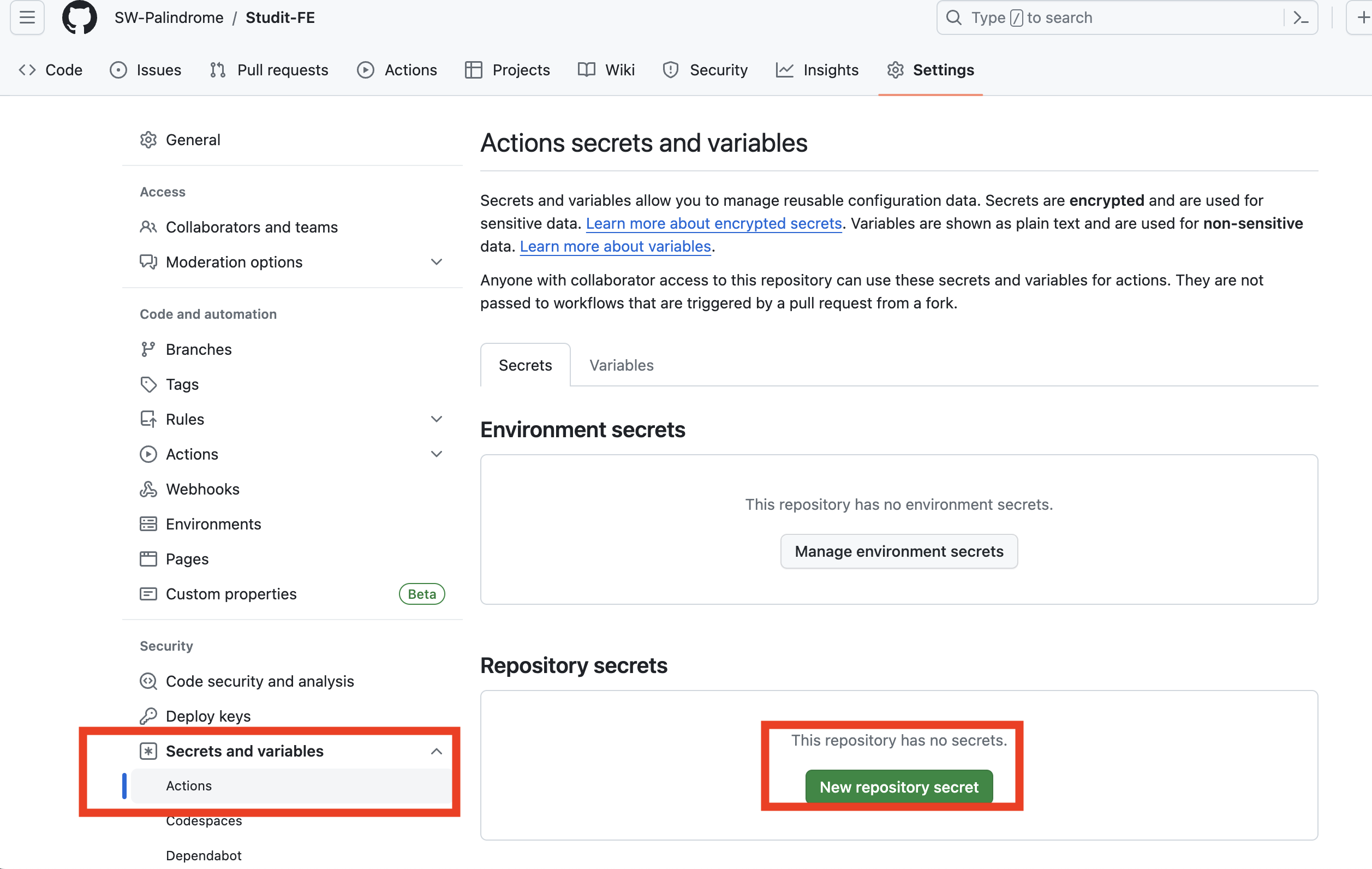 그리고 Secrets and variables에서 Actions을 눌러 Repository secrets를 추가한다.
