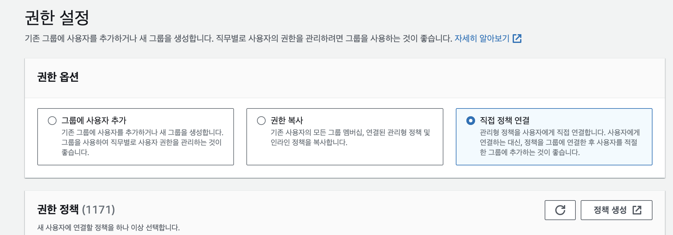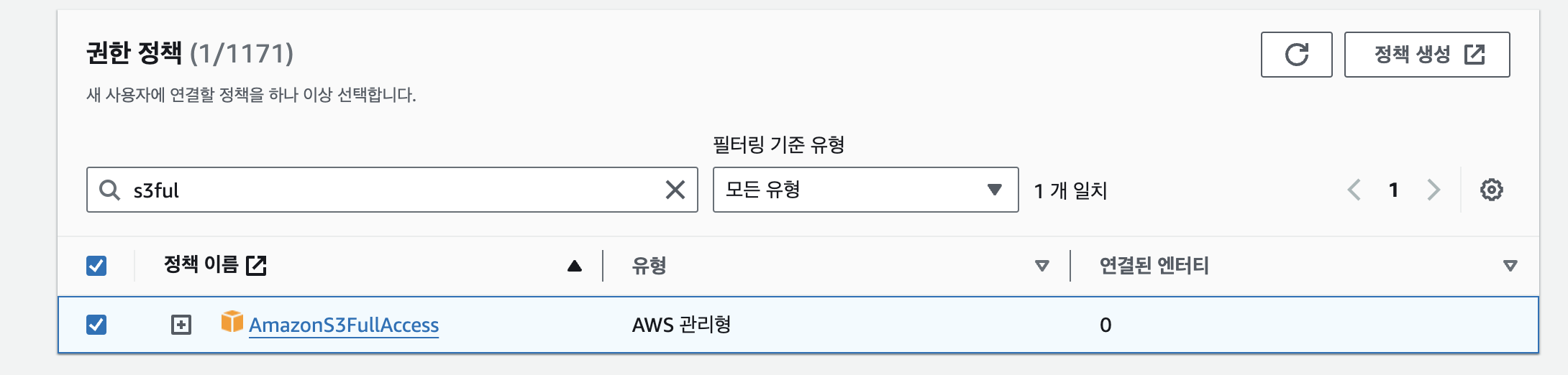 권한은 직접 정책 연결로 하여 s3 풀액세스를 때리자.