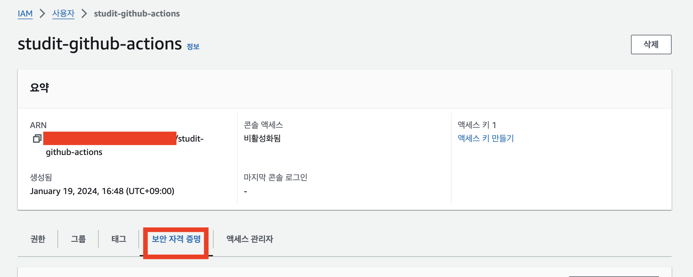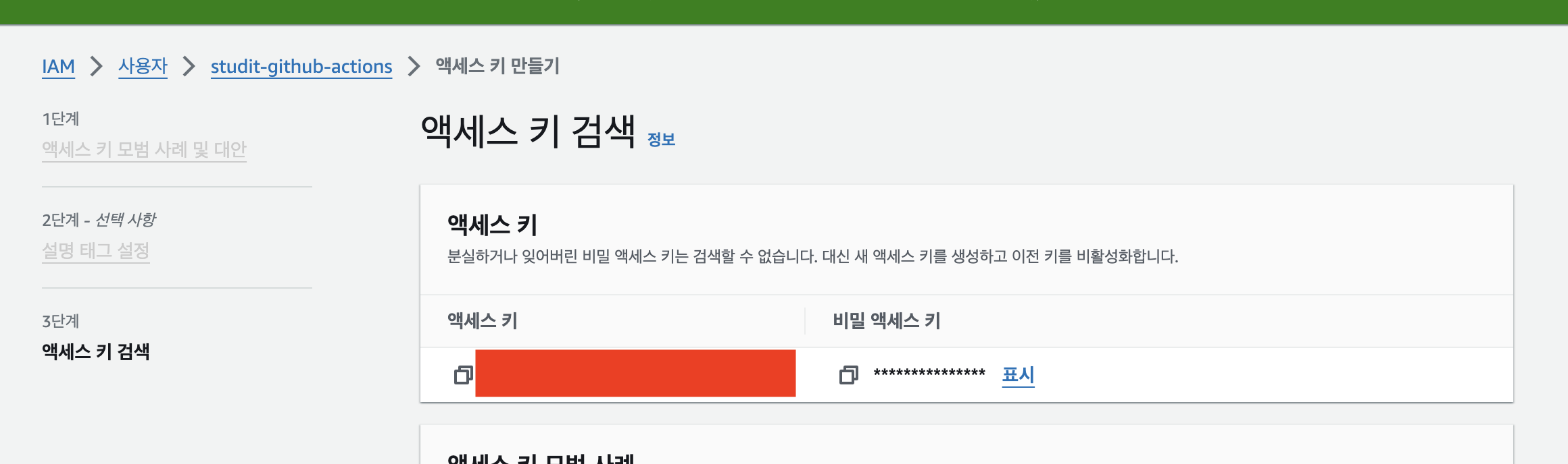 이제 이렇게 만든 사용자를 github-actions 의 빌드 머신에게 권한으로 넘겨줄 건데, 이를 보통 secret key로 관리한다.