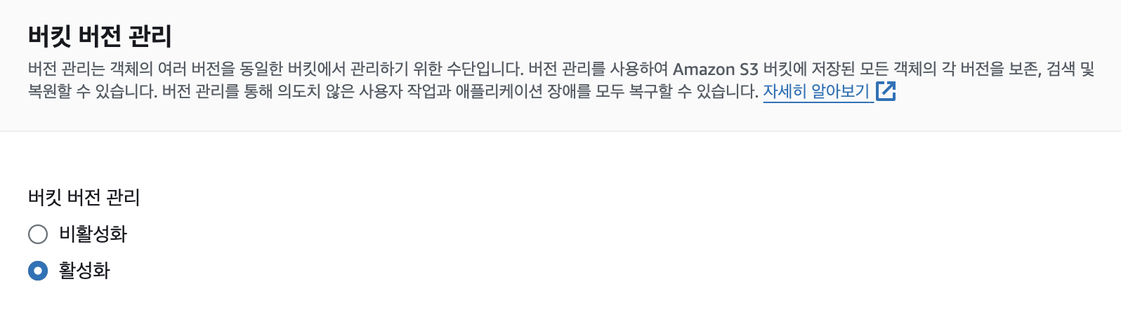 버킷 버전 관리는 혹시나 해서 활성화 한다.