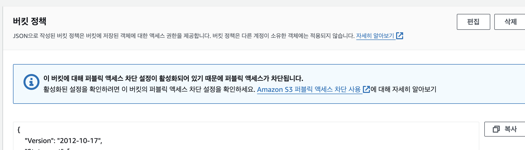 버킷 정책에 들어가 복사한 정책을 추가한다.