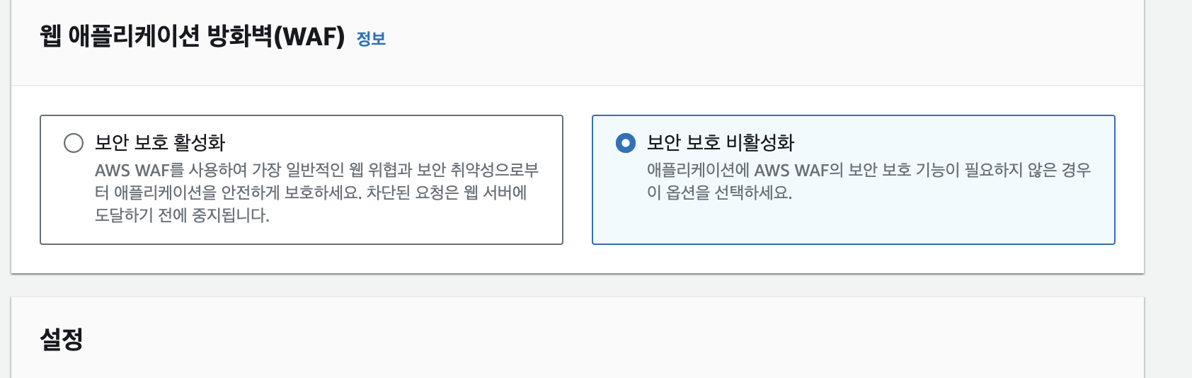 AWS WAF 도 할건지 물어보는데 돈드니까 일단 비허용을 한다.