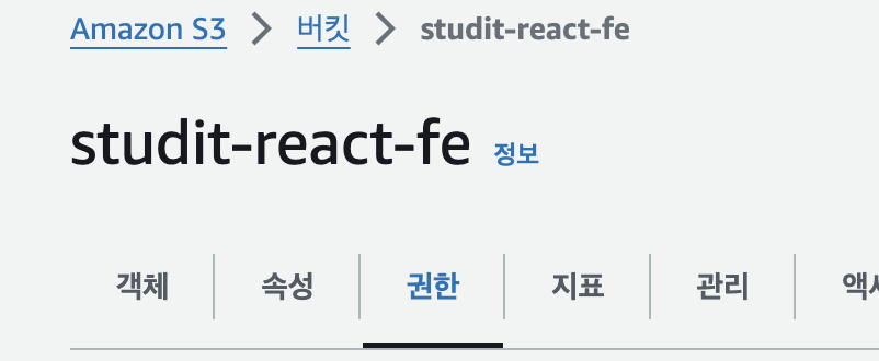 S3의 정책을 추가하기 위해 버킷-권한에 들어간다.
