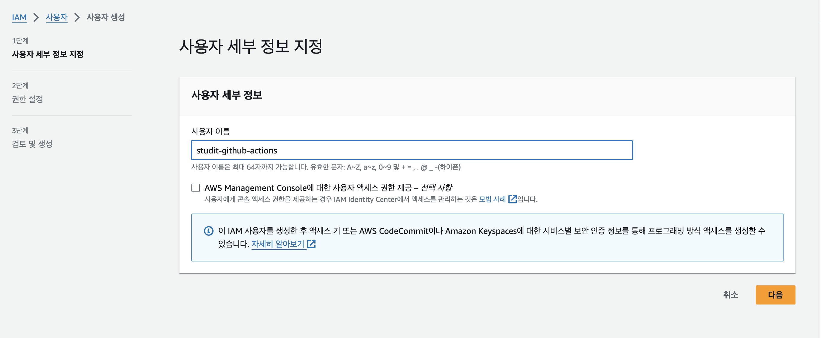 IAM - 사용자 - 사용자 생성에서 다음처럼 이름을 지정해 생성한다.
