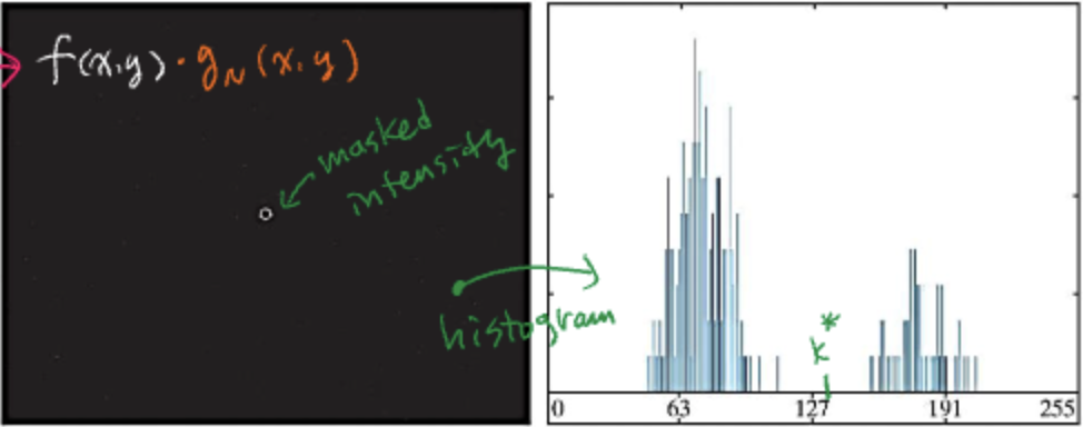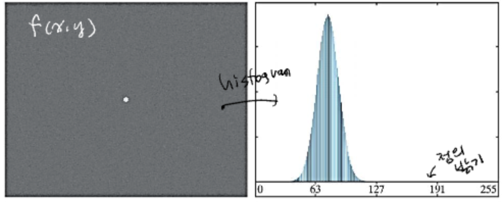 회색 배경에 아주작은 흰 점의 이미지가 있다고 하면, 히스토그램은 다음과 같다.
