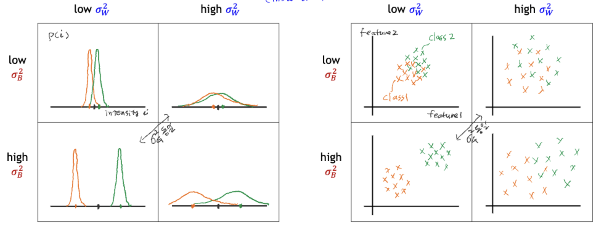 또한, (m1(k)−m2(k))2은 클래스 간의 거리제곱으로도 볼 수 있다.