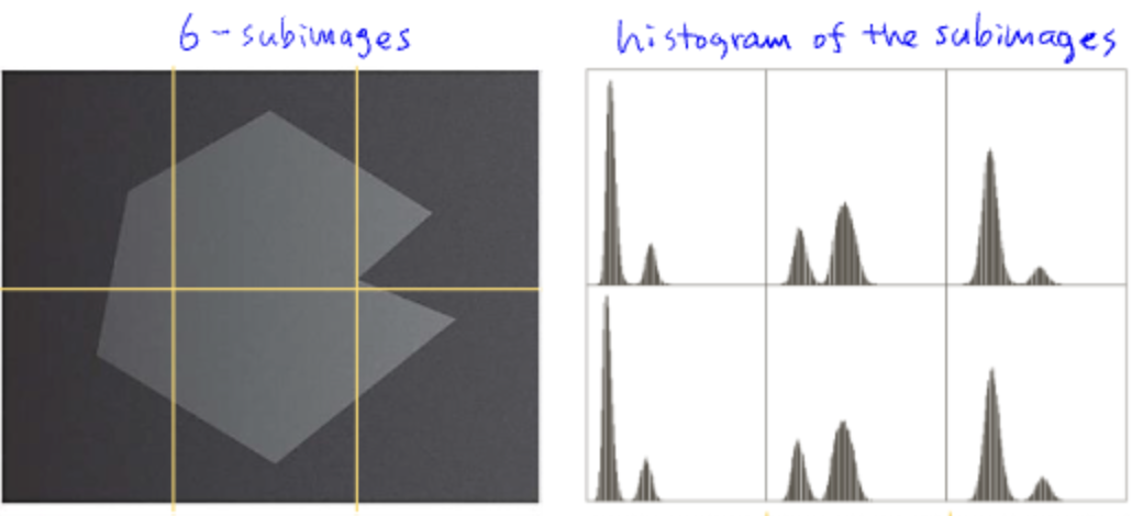 이미지를 원하는 개수만큼 sub image로 나누고 각 구간별로 히스토그램을 그린다.