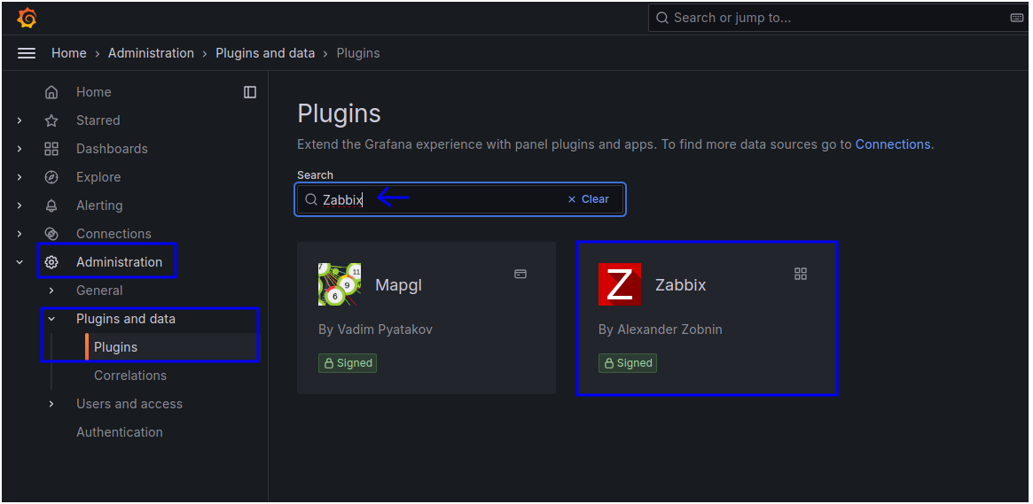 Administration → Plugins and data → Plugins → 'Zabbix' 검색 → 결과 클릭