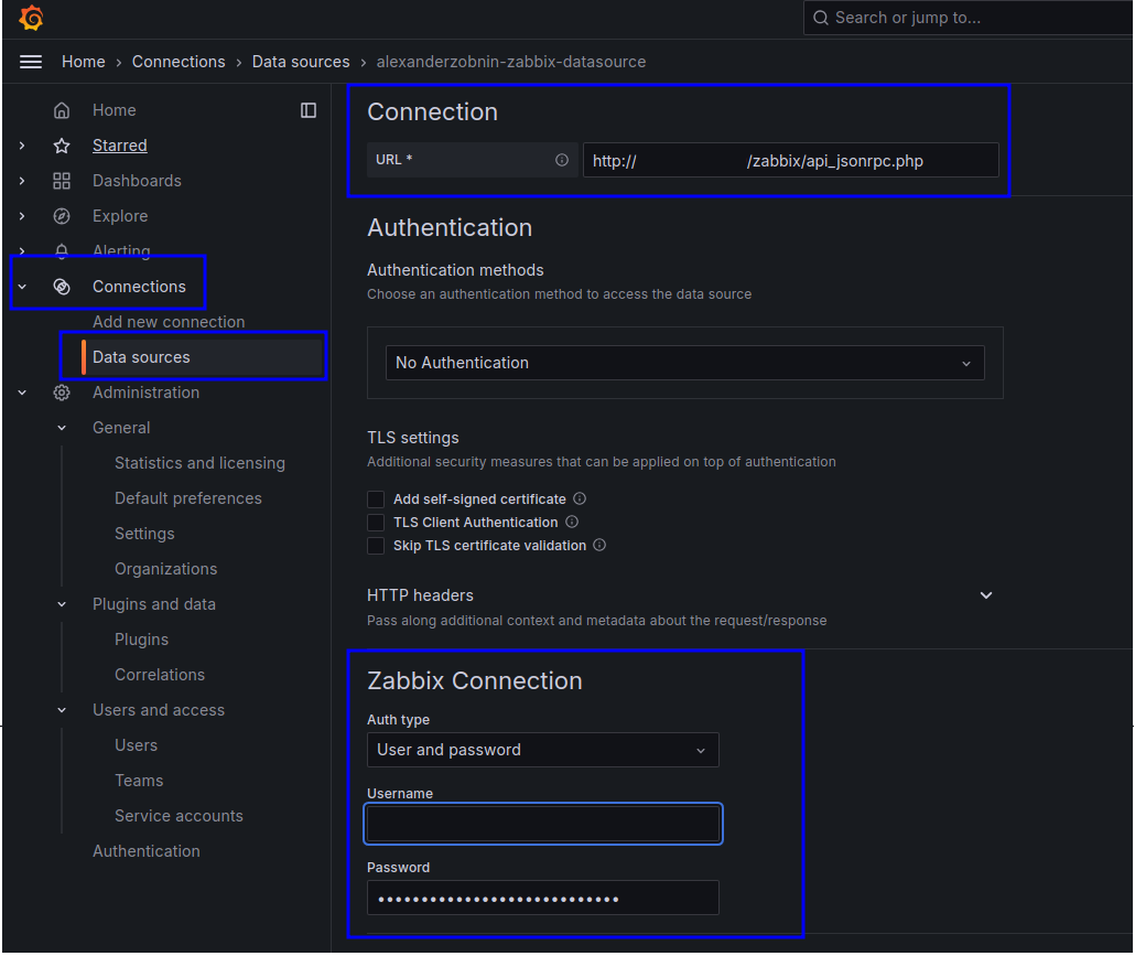 Connections → Data sources → Add → Zabbix → URL, 접속정보 입력