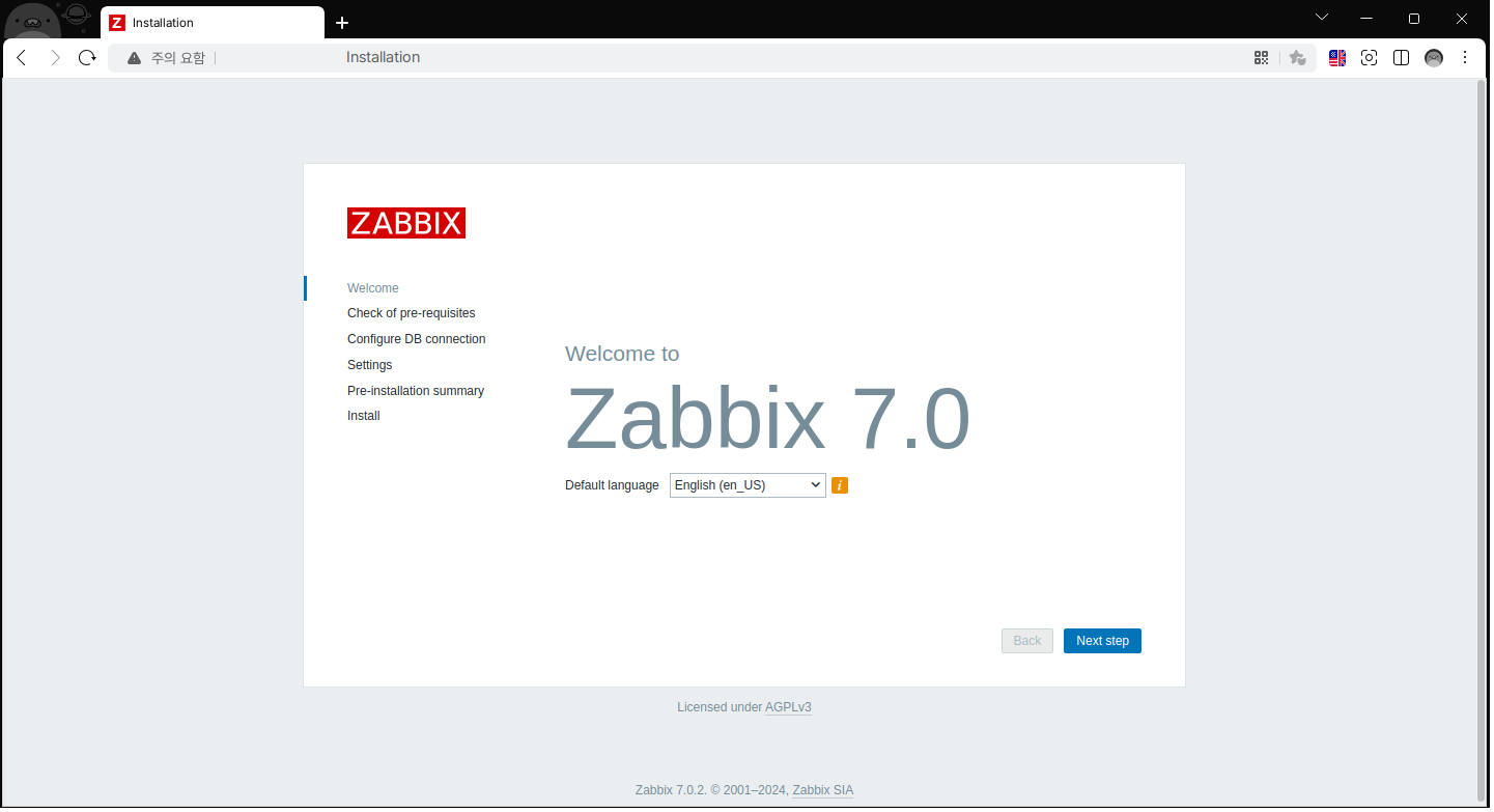 http://IP/zabbix 입력하여 설치 페이지 접속