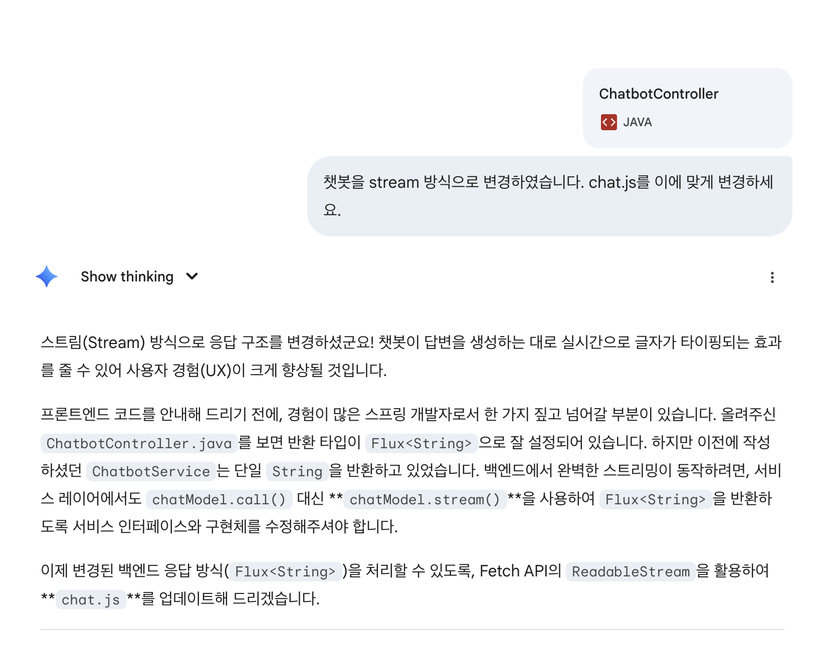 변경된 코드로 애플리케이션을 실행하면 GPT가 응답을 생성하는대로 글자가 타이핑되는 것처럼 보이게 된다.