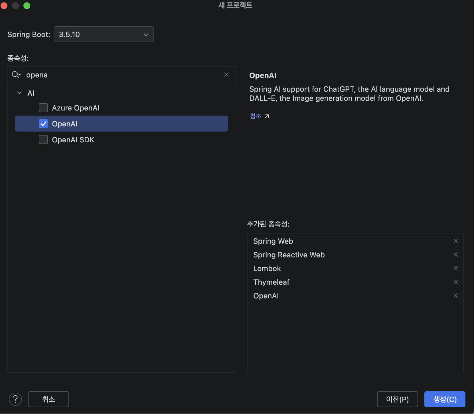 Dependency : Spring Web, Spring Reactive Web, Lombok, Thymleaf, OpenAI