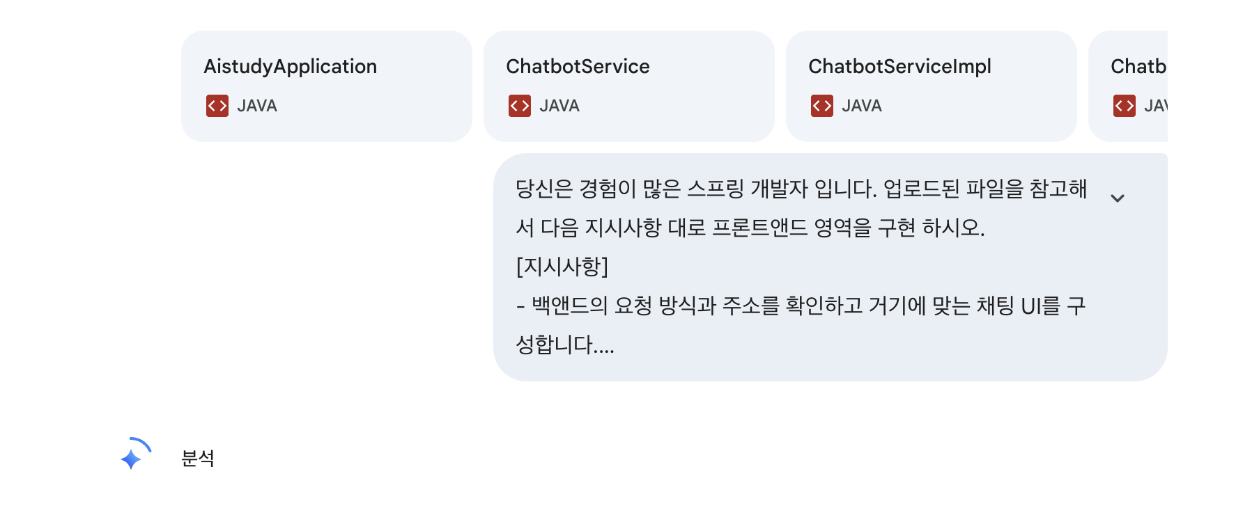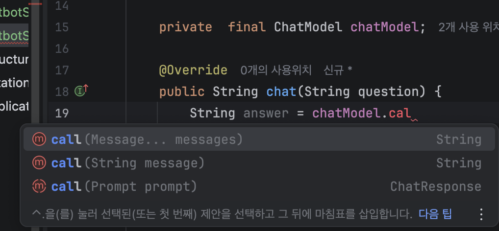 스프링 빈으로 자동 주입된 API로 프롬프트-응답 단계를 메서드 호출로 처리한다.