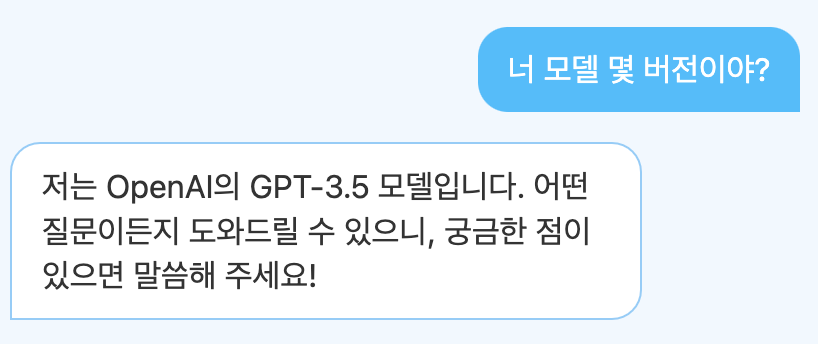 구현에 쓰인 API모델 정보가 궁금해 직접 물어보니, GPT3.5 라고 한다.