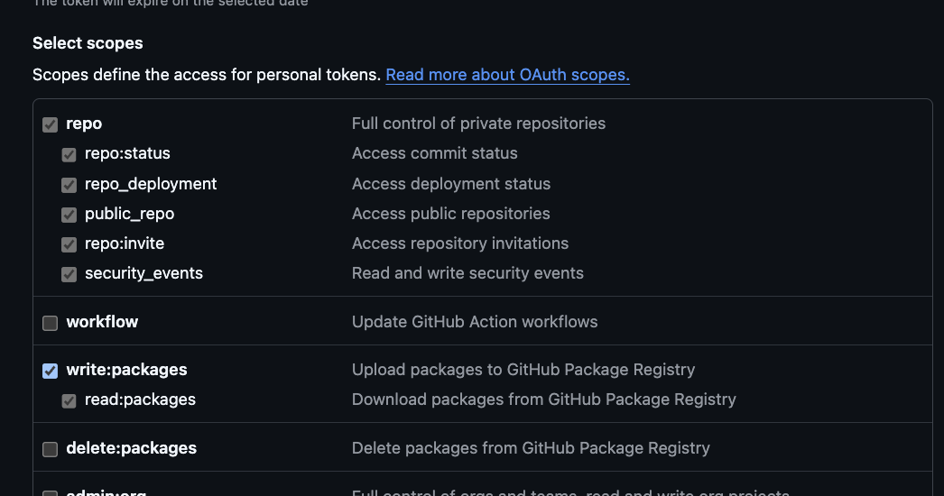 권한 Scope로 write:packages와 read:packages가 포함된 토큰을 발급해준다. (Classic 방식 권장)