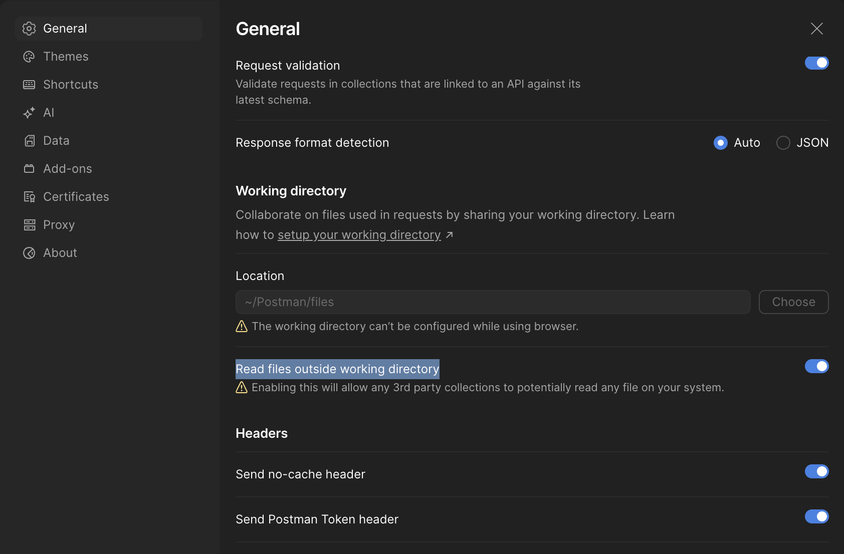 postman에서 파일을 업로드 할 땐, 지정된 디렉토리에서 파일을 업로드 하거나, 3rd Party 디렉토리에서 업로드하는것을 허용해줘야 한다.