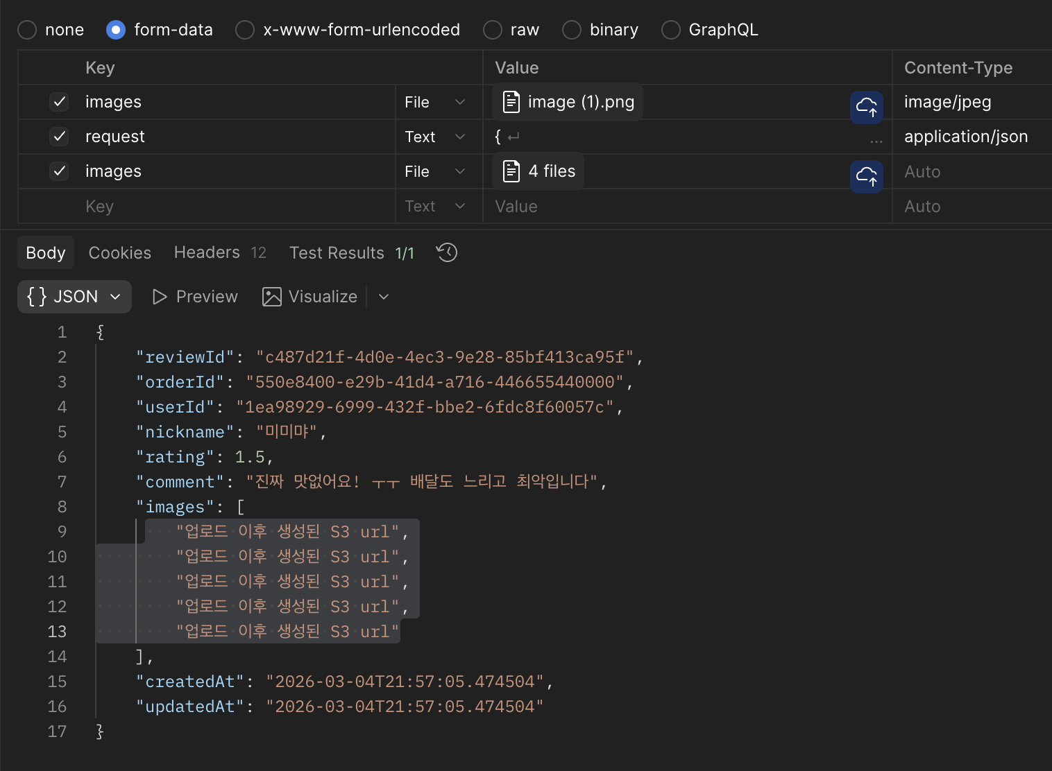 multipart/form-data 방식으로 이미지 파일 부분과 기존의 json 부분을 나눠 요청을 받을 수 있다.
