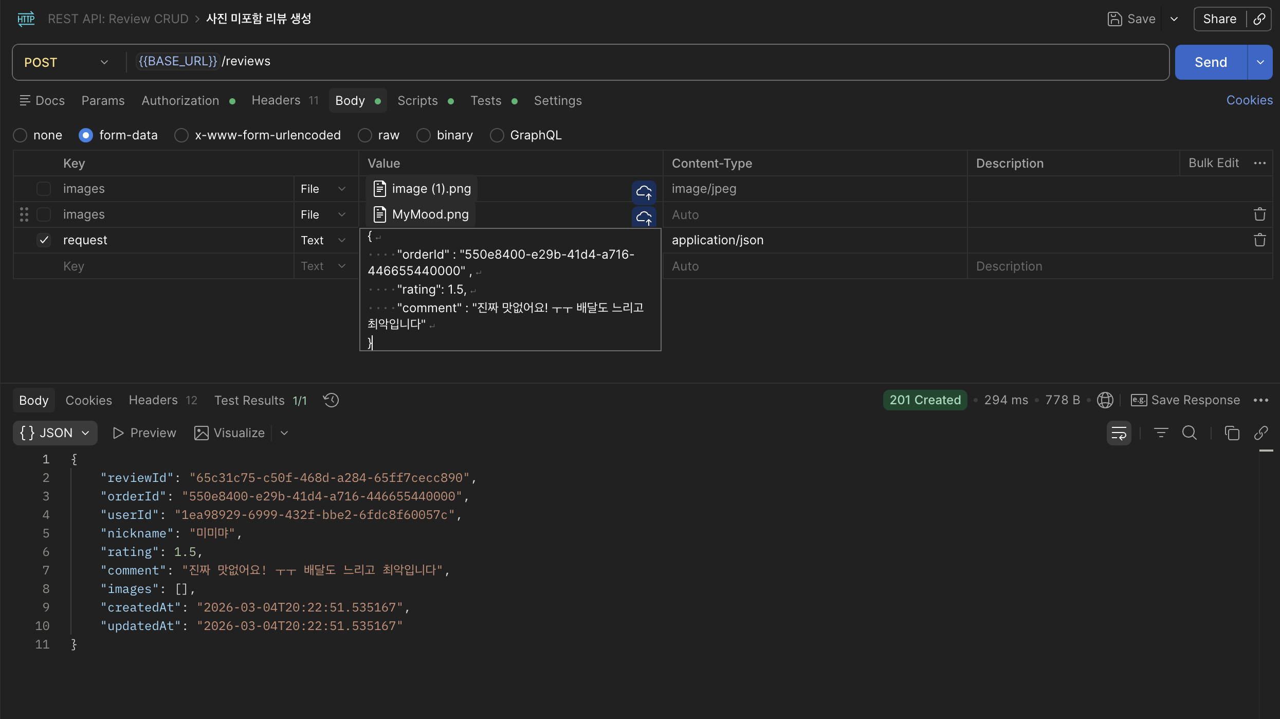 reviewService.createReview(userDetails.getUsername(), request, images);