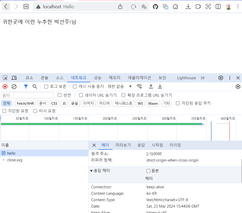 서버를 실행하고 localhost:8080/hello 경로로 요청하면 다음과 같이 컨트롤러에서 담아준 데이터를 포함한 html 페이지가 보이게 된다.