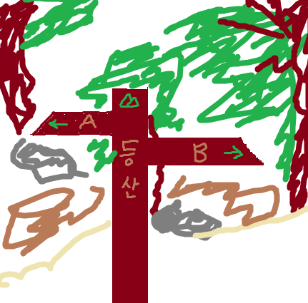 어떤 산을 등산하는것에 대해, 정상으로 가는 갈림길이 A, B 두 방향으로 나 있어서