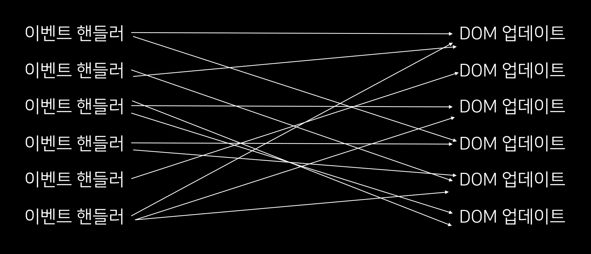 처리해야 할 이벤트도 다양해지고, 관리해야 할 상태값도 다양해지고, DOM 도 다양해지게 된다면, 이에 따라 업데이트를 하는 규칙도 많이 복잡해지기 때문에, 조금 과장을 많이 하자면 코드가 다음과 같은 형태가 된다.