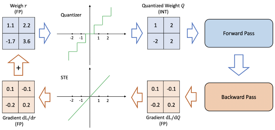 STE는 Forward시에 진짜 양자화(rounding)로 값이 뭉개지게 만들고, backward에서는 rounding을 없는 셈치고 기울기를 1로 근사해서 gradient를 통과시킨다.
