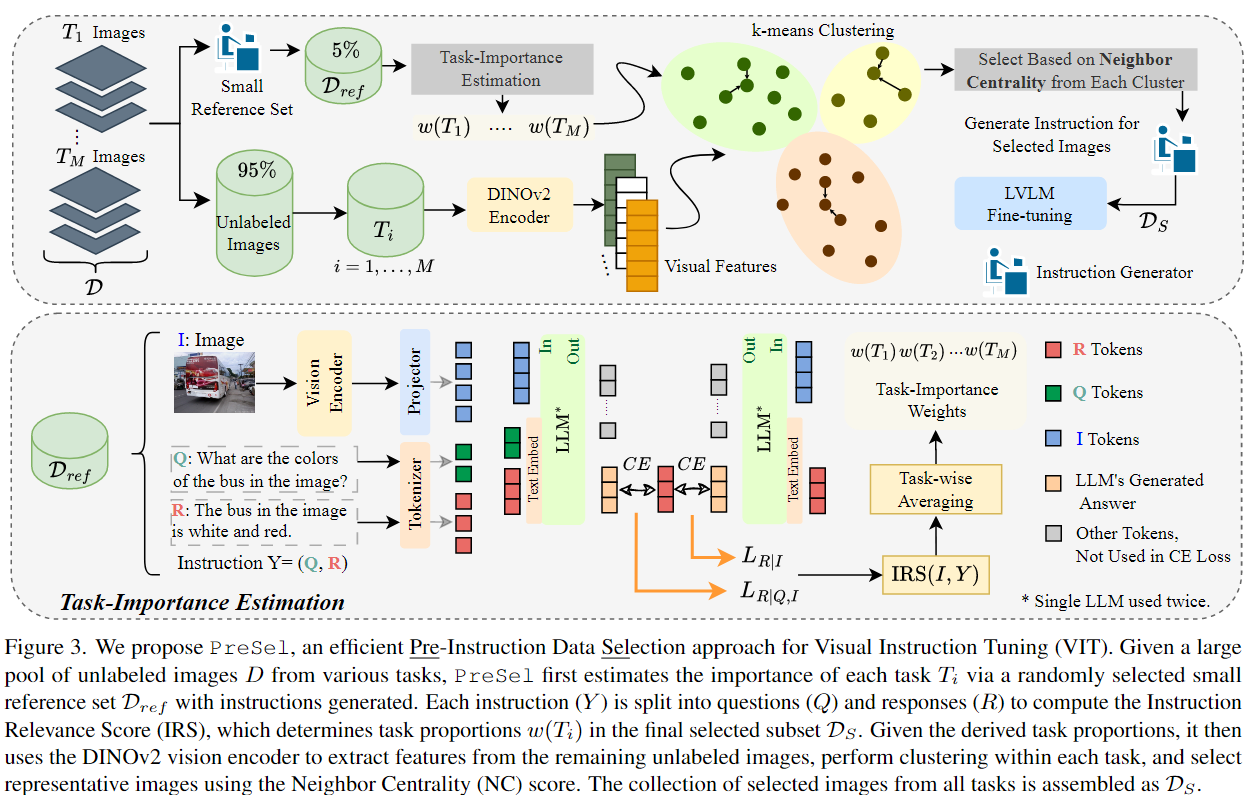 Pre-instruction Data Selection의 목표는, Label이 없는 image 집합 에서 높은 가치가 있는 작은 부분 집합 을 고른 뒤, 이 작은 집합에 대해서만 instruction을 생성하는 것이다.